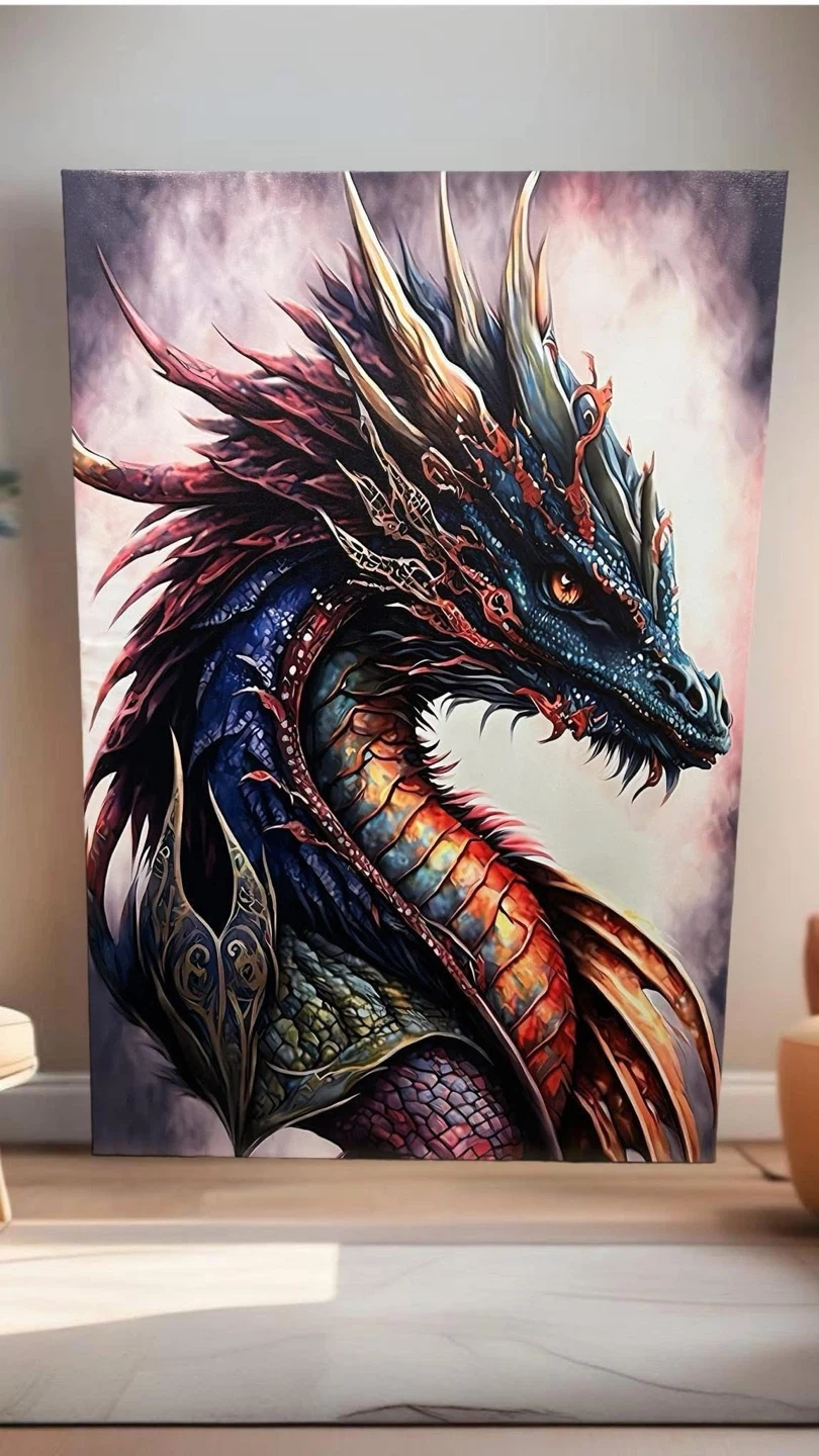 Beautiful canvas art featuring a detailed dragon. The colours are vibrant and the detail is amazing. Roughly 28 x 44 inches