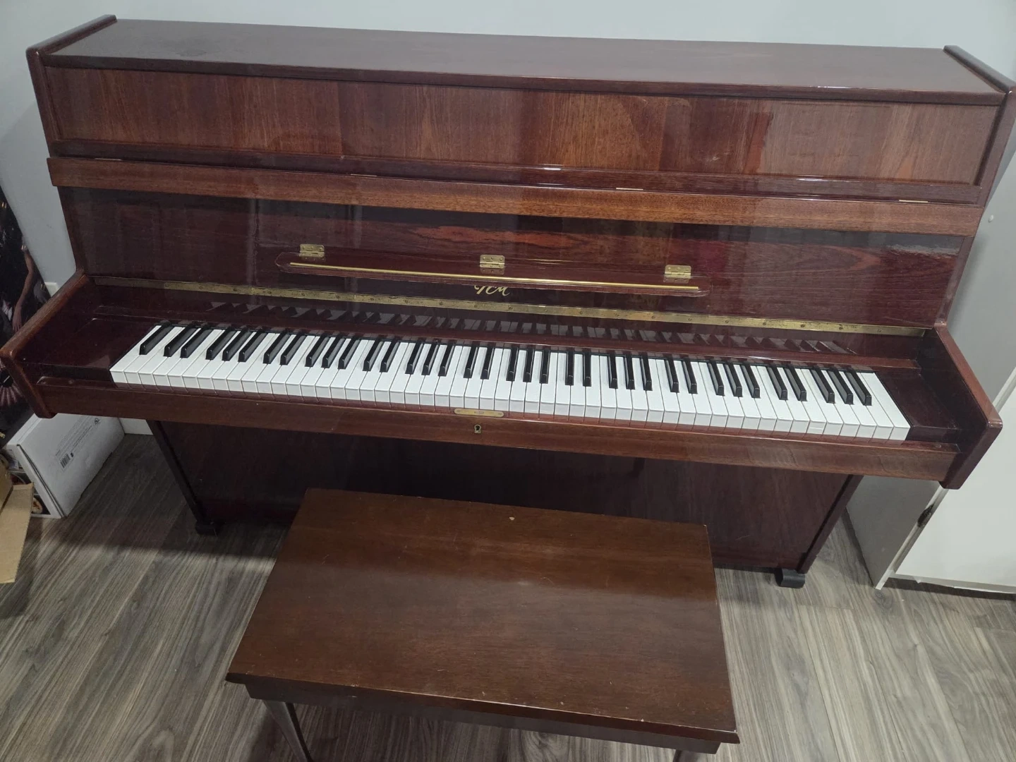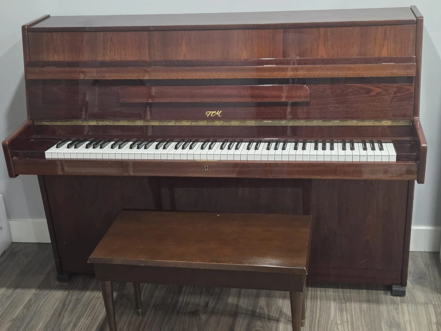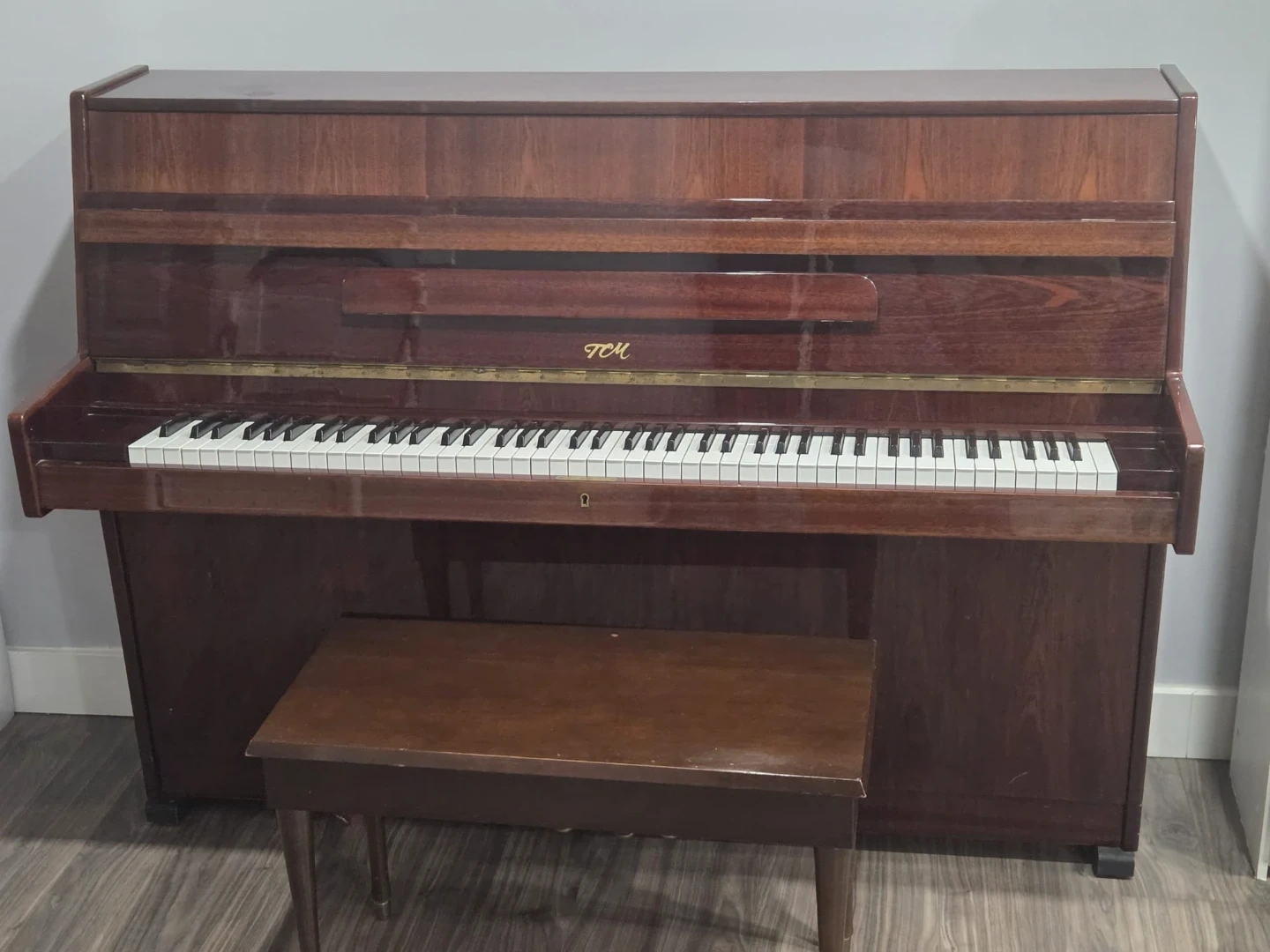 A lovely TCM upright piano. It comes with a matching wooden bench. This piano has a rich, warm tone, perfect for practicing or performance. It's a wonderful addition to any home!