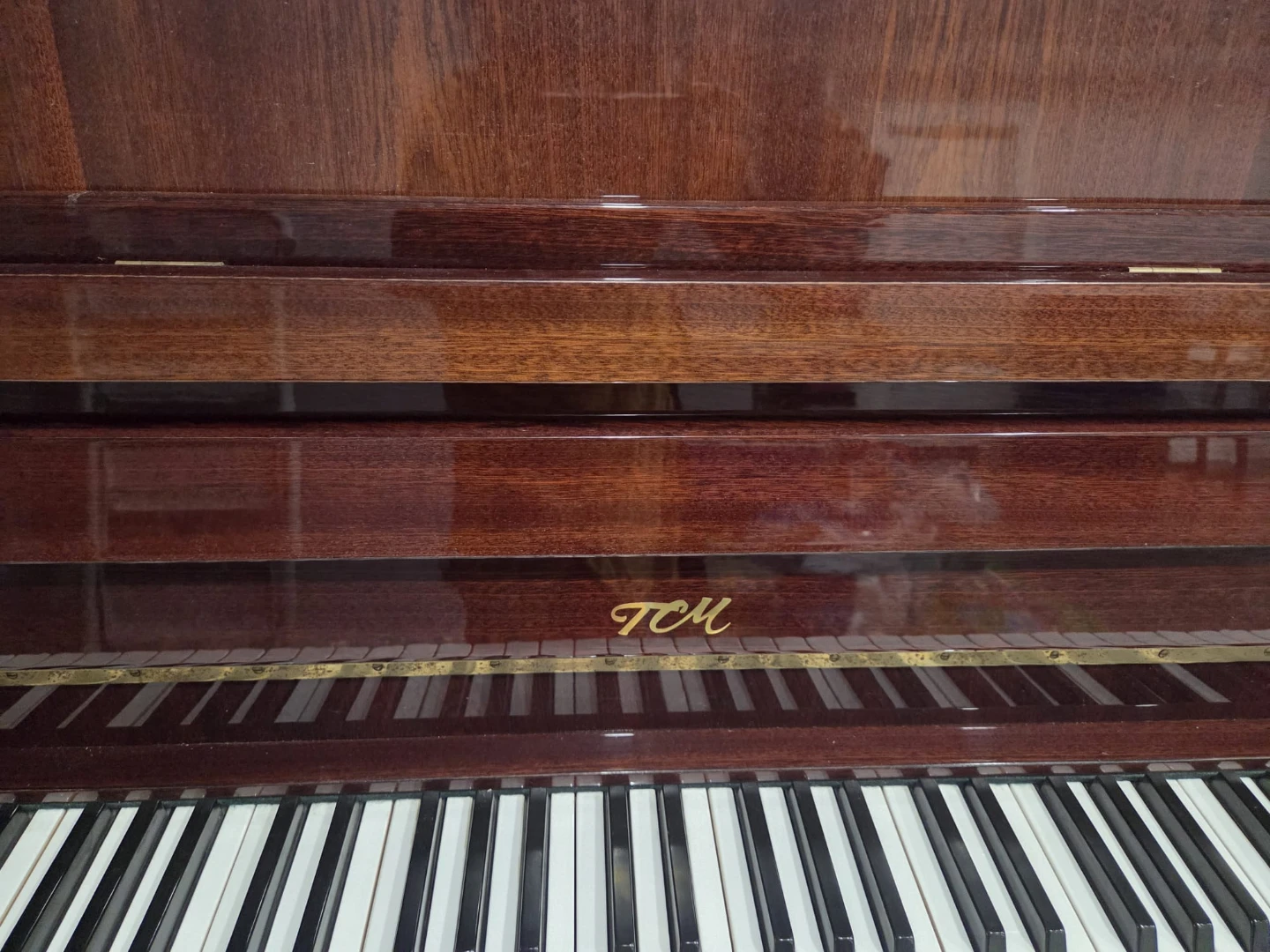 A lovely TCM upright piano. It comes with a matching wooden bench. This piano has a rich, warm tone, perfect for practicing or performance. It's a wonderful addition to any home!