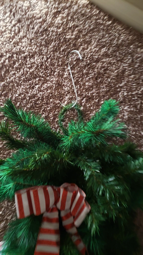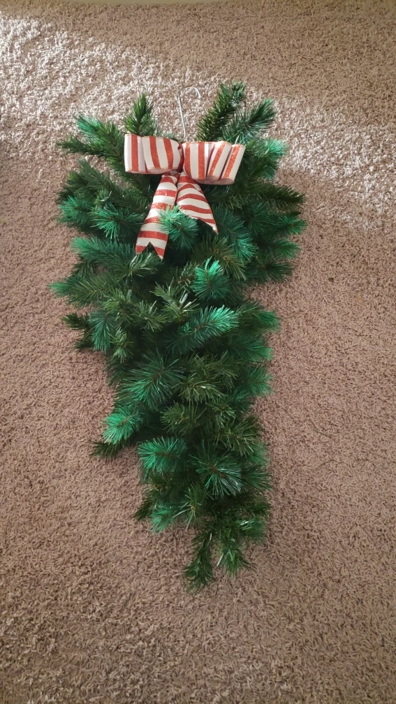 2 Teardrop Swags and 3 -Christmas Wreaths 11 in round and 13 in round and 18 in round.6 Candy Cane Hooks.