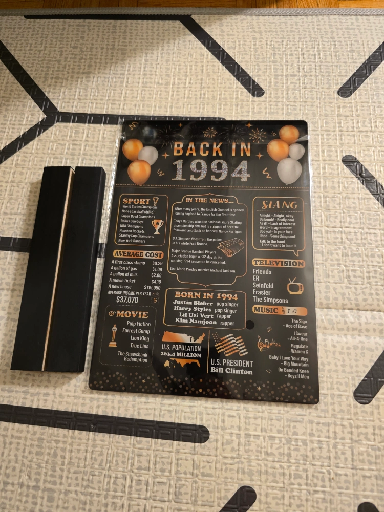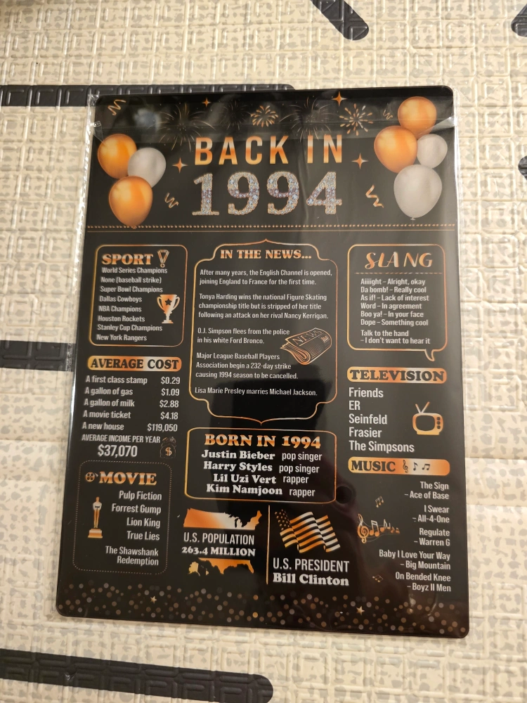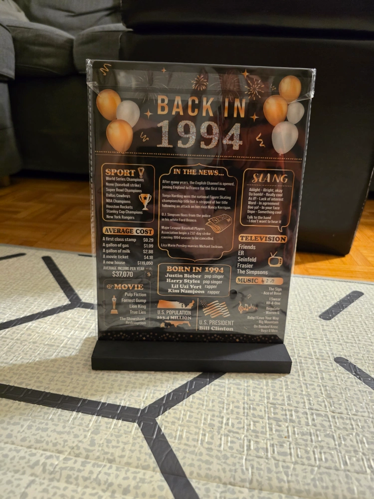 Acrylic sign featuring a nostalgic look back at the year 1994. Includes details on sports, news, slang, television, music, movies, and more. Comes with a black stand.