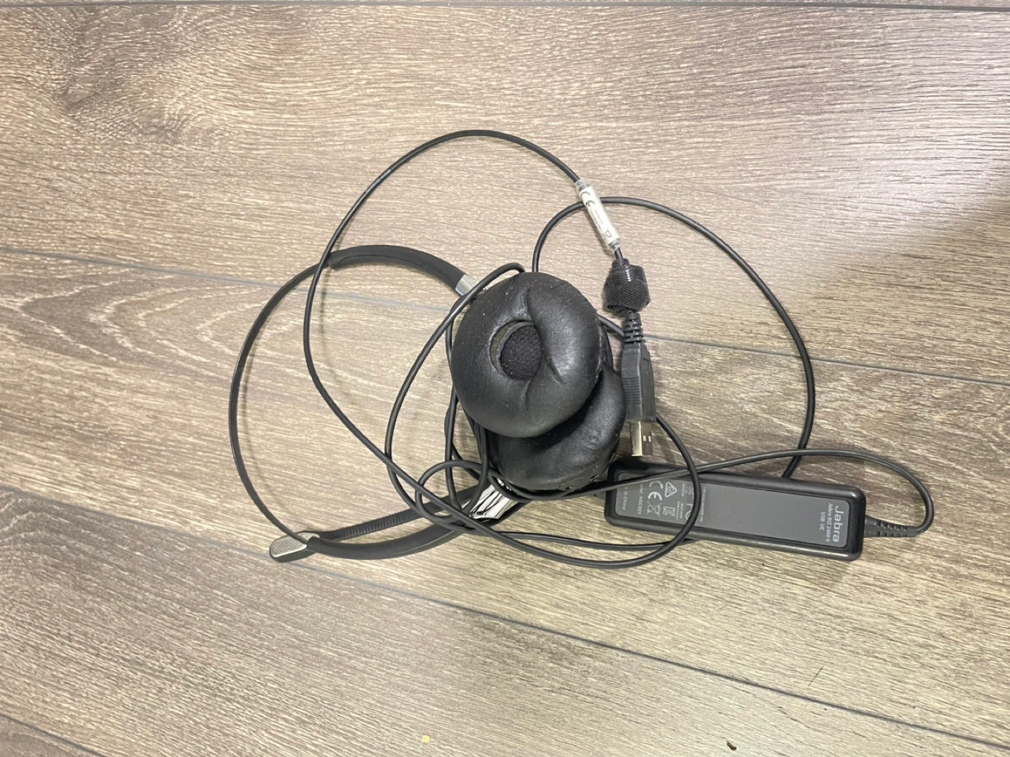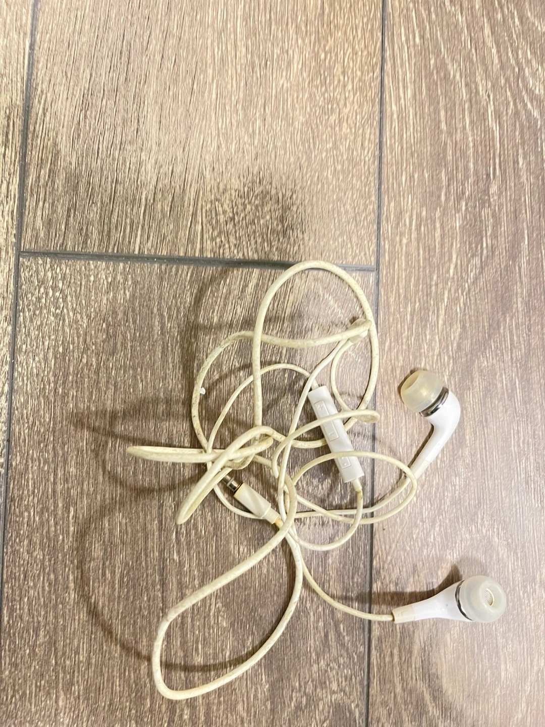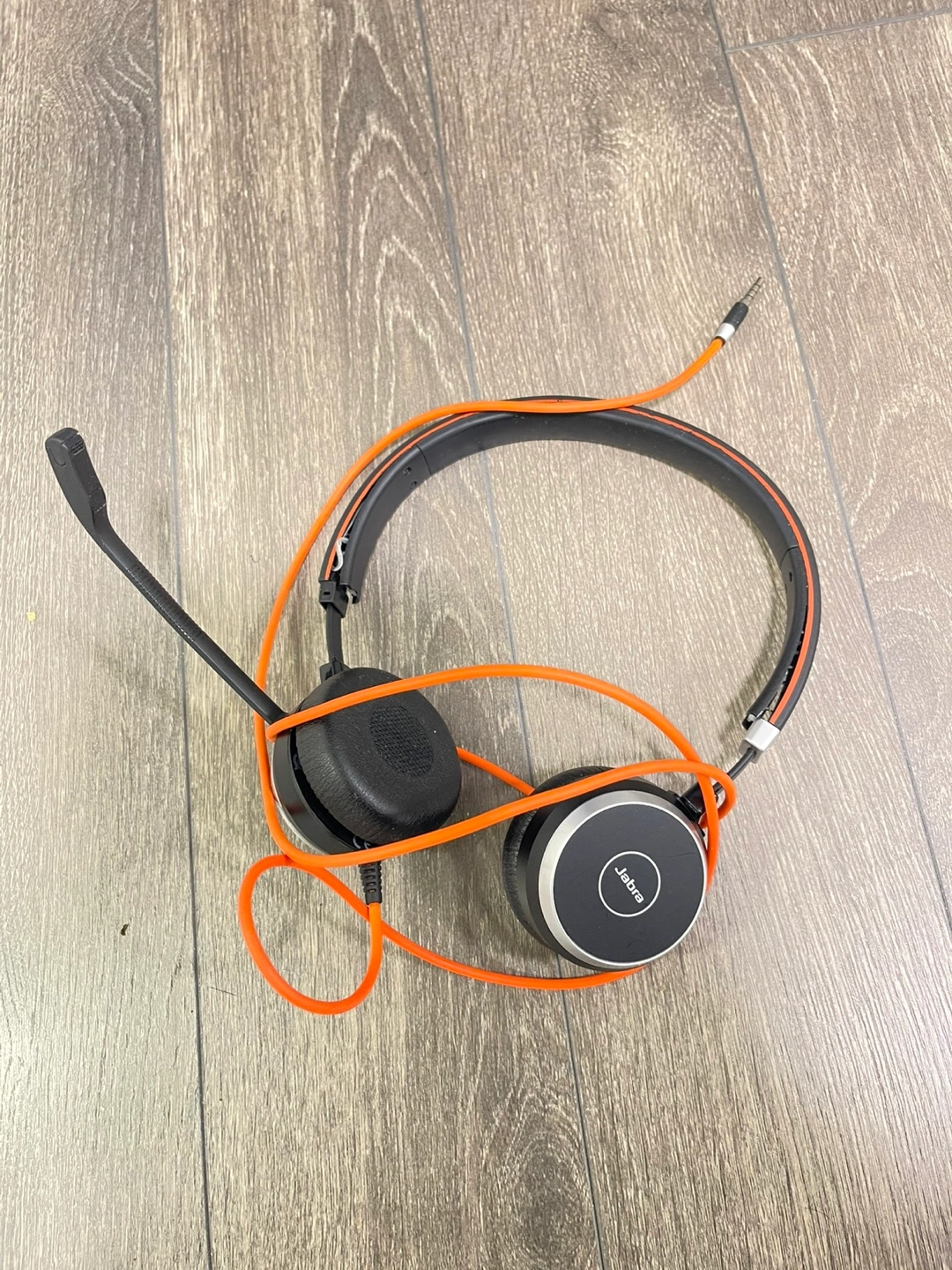 Three pairs of used headphones. One white wired earbuds, one black wired headset with USB connection and a small control unit, and one black and orange wired headset. Pre-owned, some wear and tear.