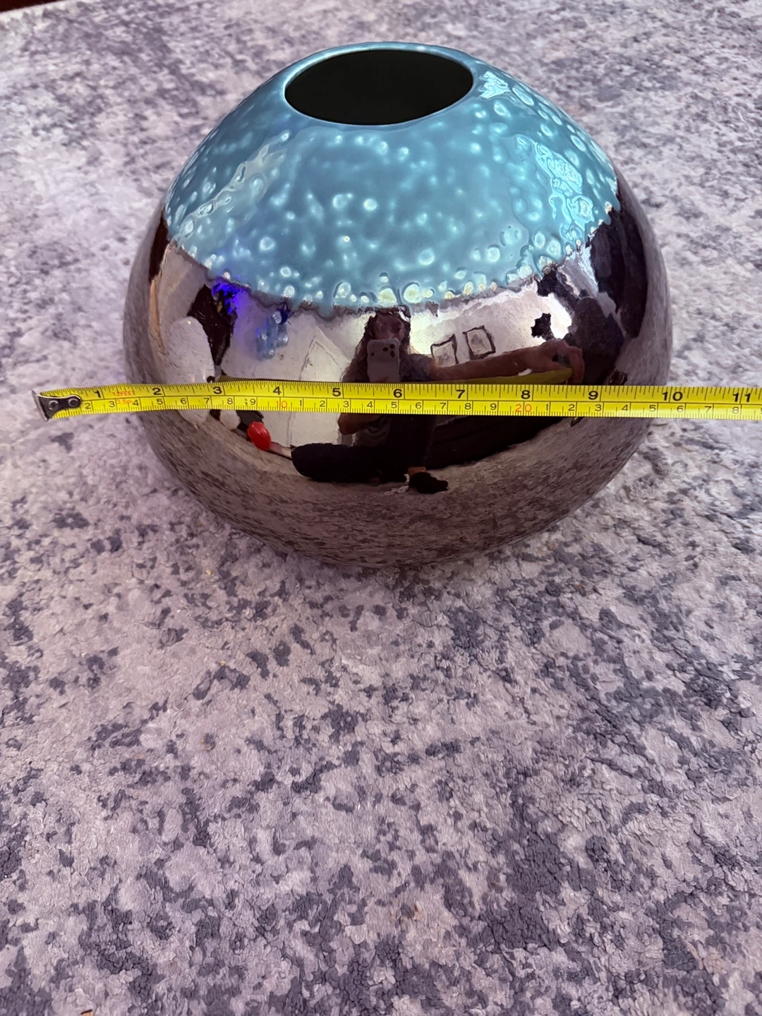 Selling a beautiful handmade vase from Euroline, crafted in Sri Lanka! It has a unique design with a glossy, reflective bottom and a textured, light blue top. The vase is about 9 inches tall