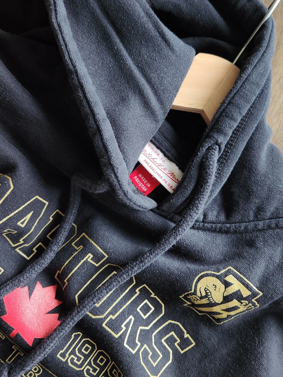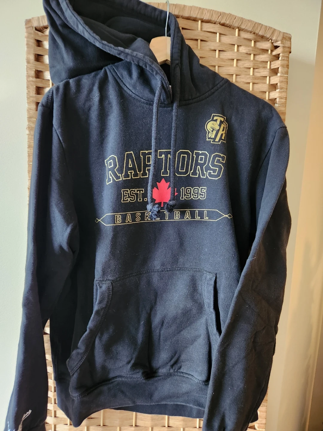 Selling a Mitchell & Ness Raptors hoodie in Size M. It's black with the Raptors logo and a red maple leaf. It's in great condition and perfect for any Raptors fan!