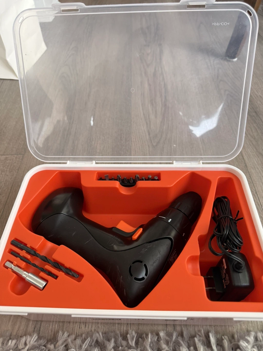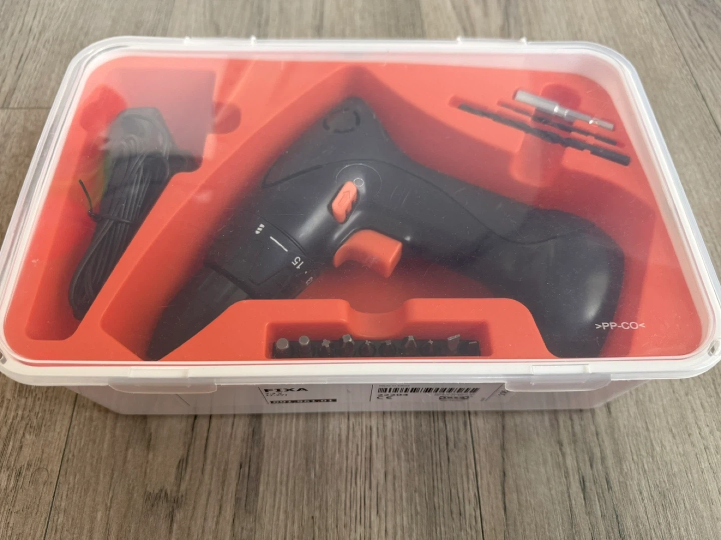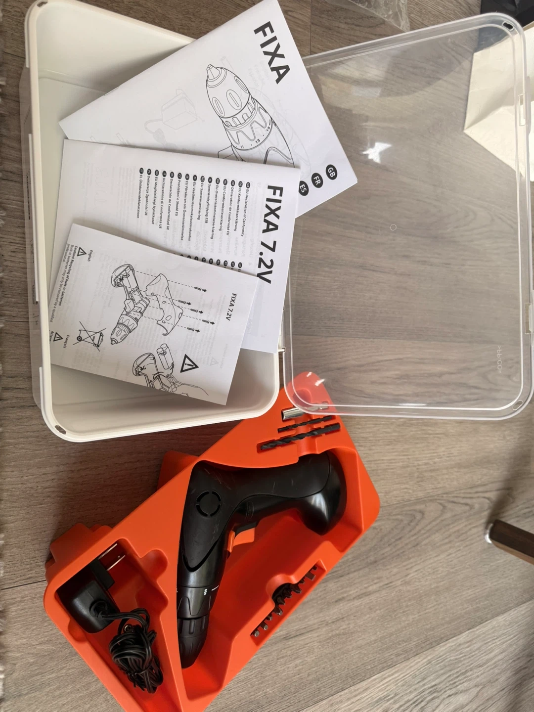 This is an IKEA FIXA 7.2V cordless screwdriver drill. It comes with a charger and various drill bits and screwdriver bits. It's housed in a clear plastic carrying case for easy storage and transport. Includes original instruction manual. Pick up only