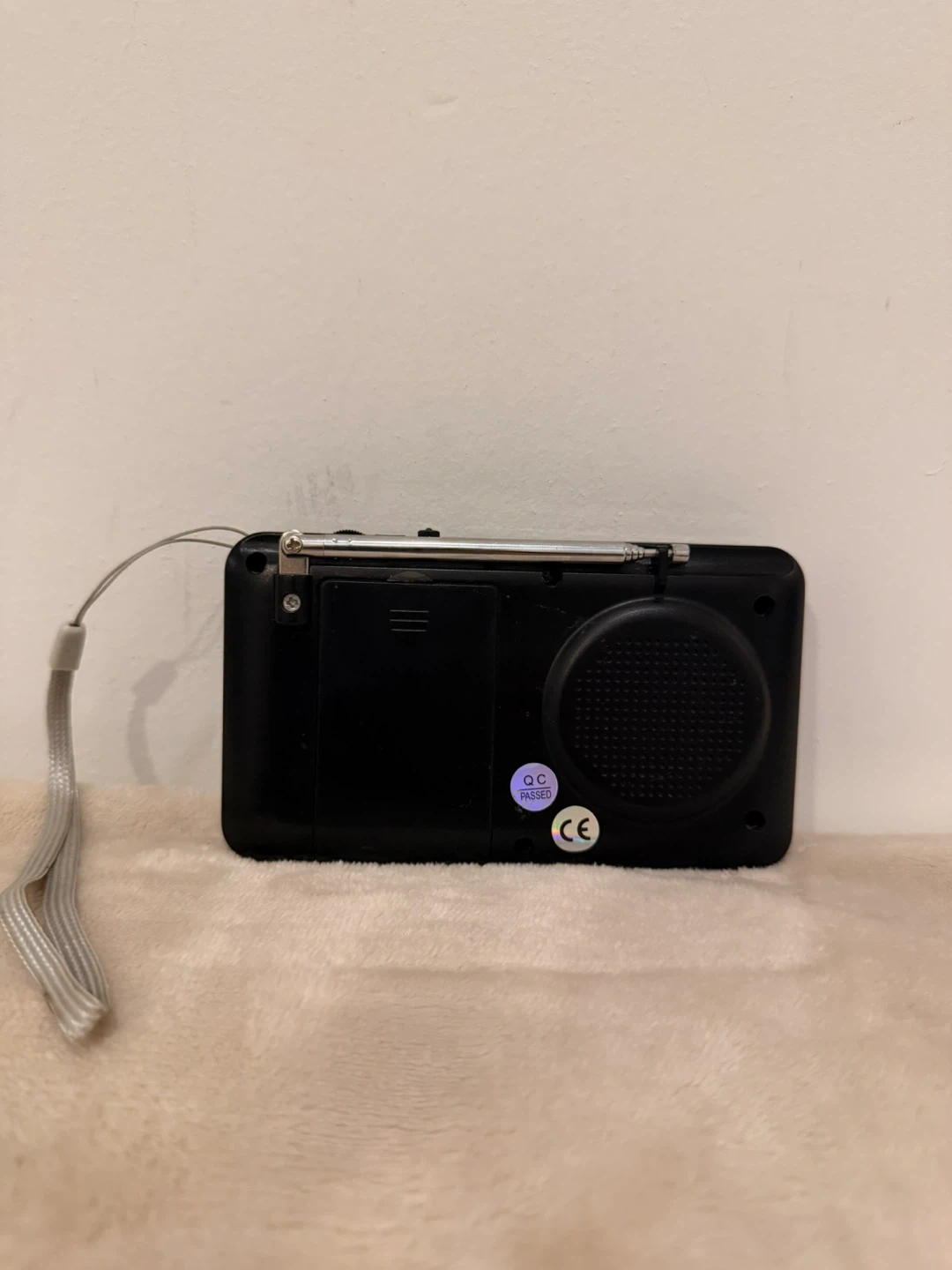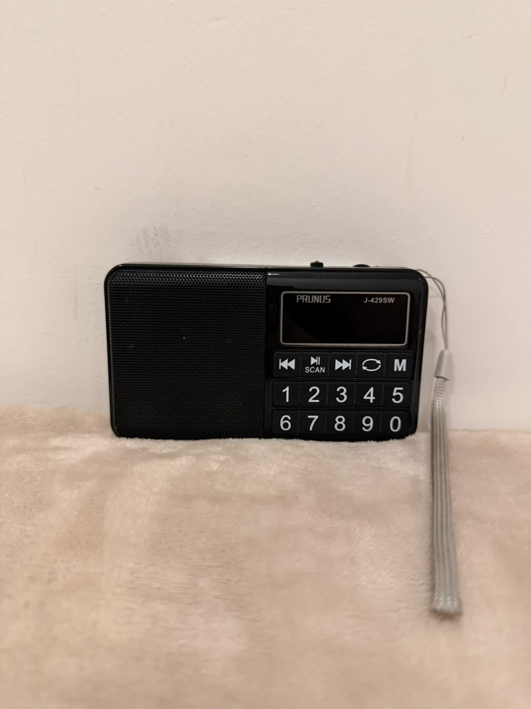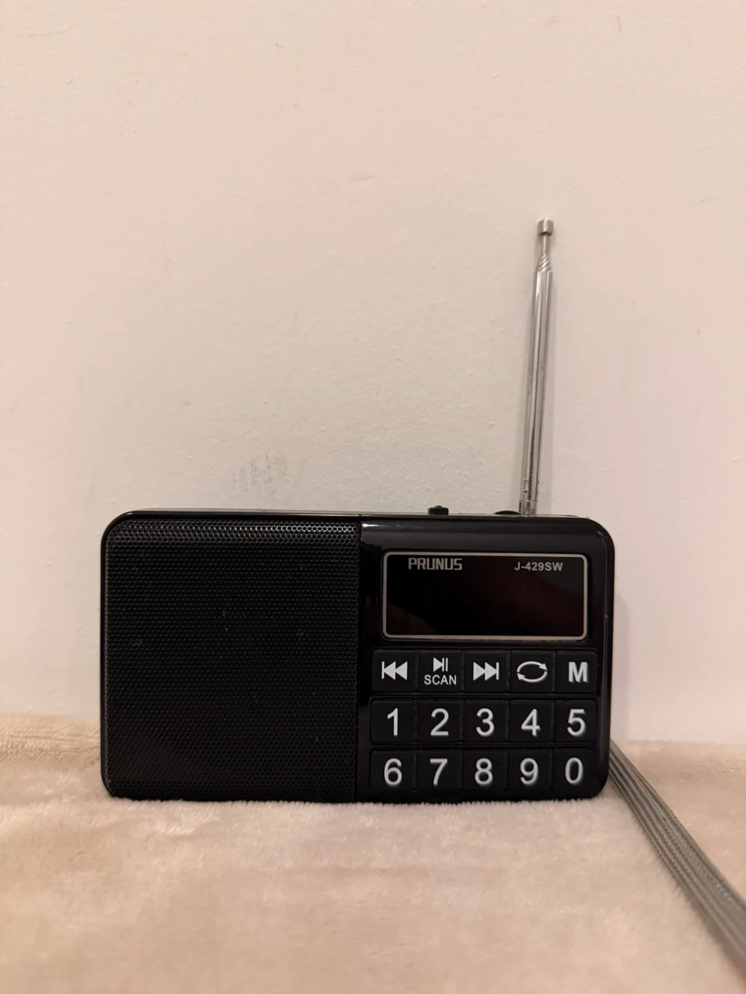 This is a PRUNUS J-429SW portable radio. It's black and features a digital display with number buttons for station selection. The telescopic antenna is also included.