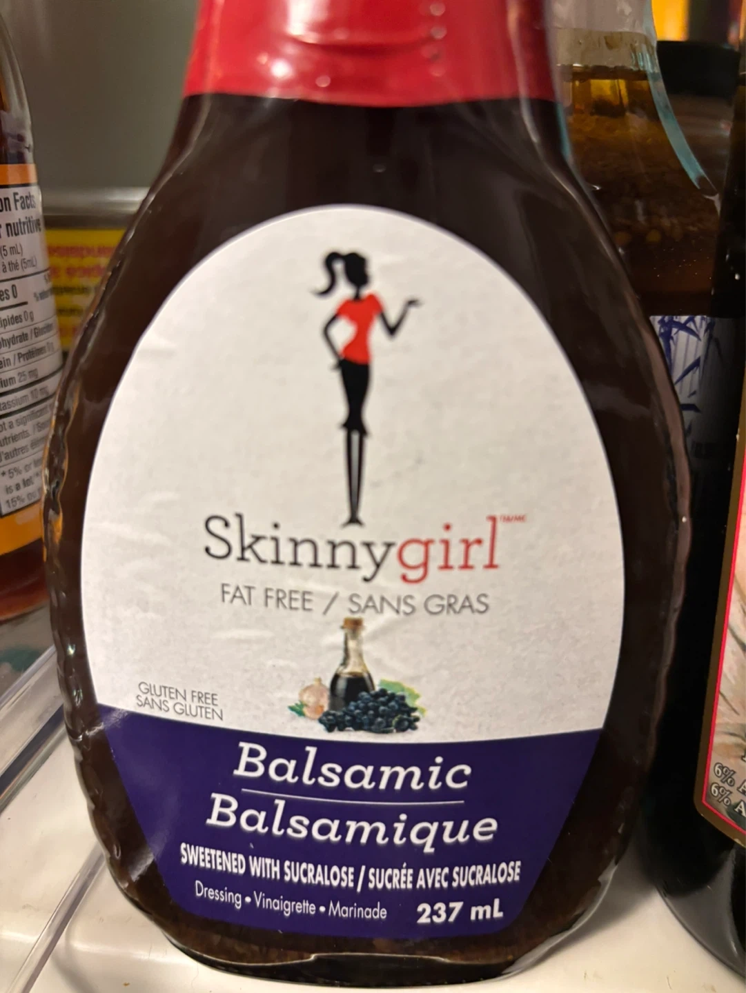 Fat-free balsamic vinaigrette and marinade. Sweetened with sucralose and gluten-free. 237 mL bottle.