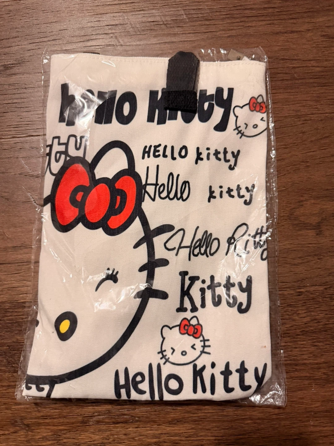 I have a brand new Hello Kitty tote bag for sale! It's still in its original packaging. The bag features a cute Hello Kitty design with black accents. Super cute! Perfect for carrying your everyday essentials.