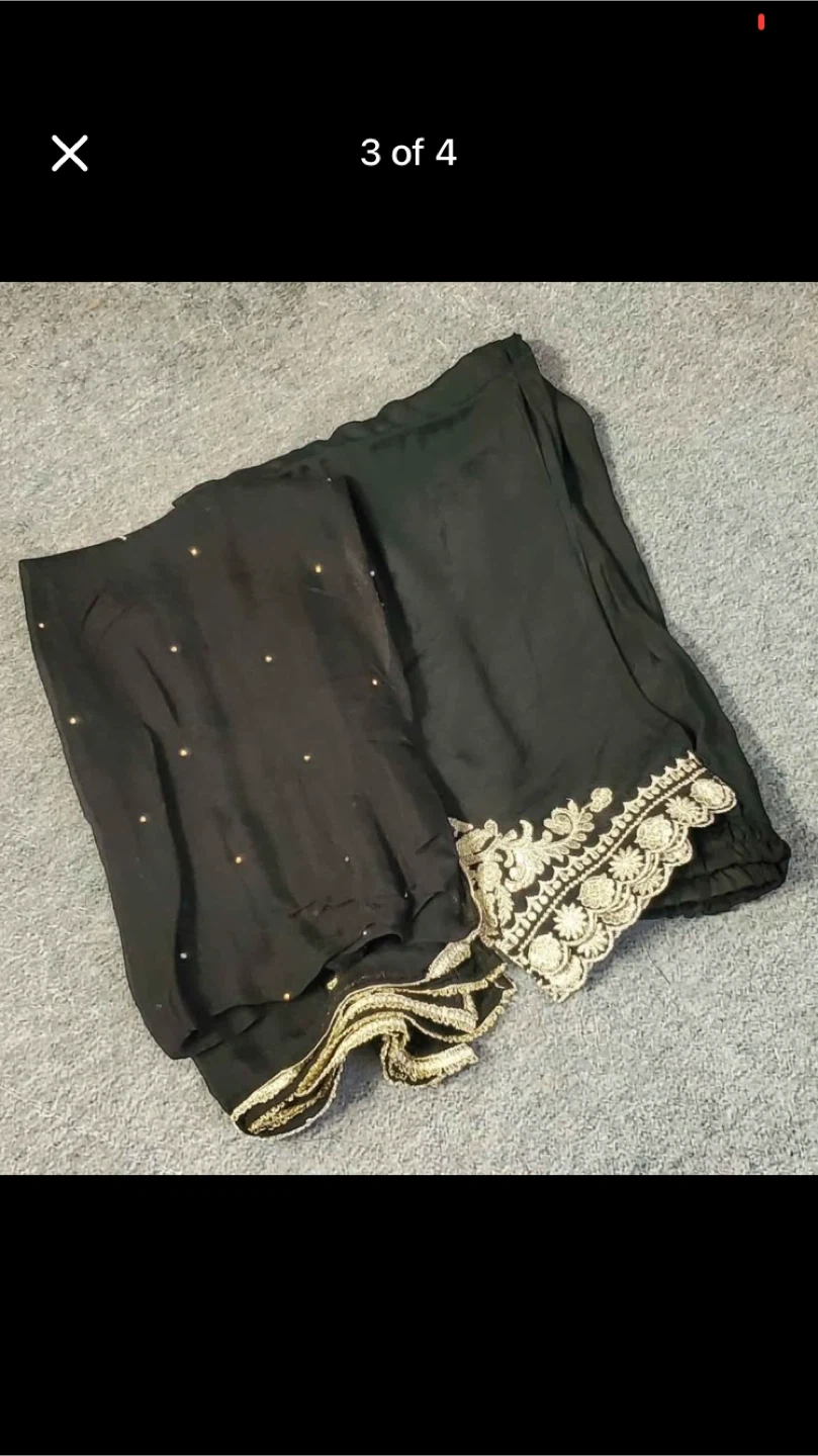 Beautiful Anarkali dress in black with intricate gold embroidery. Perfect for special occasions or adding a touch of elegance to your wardrobe! The dress features sheer sleeves and delicate detailing.