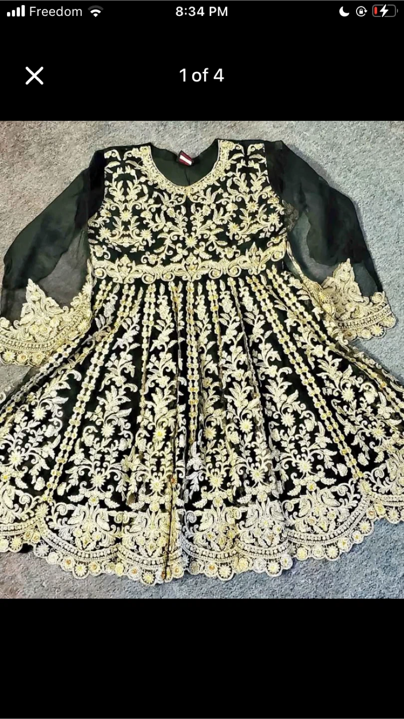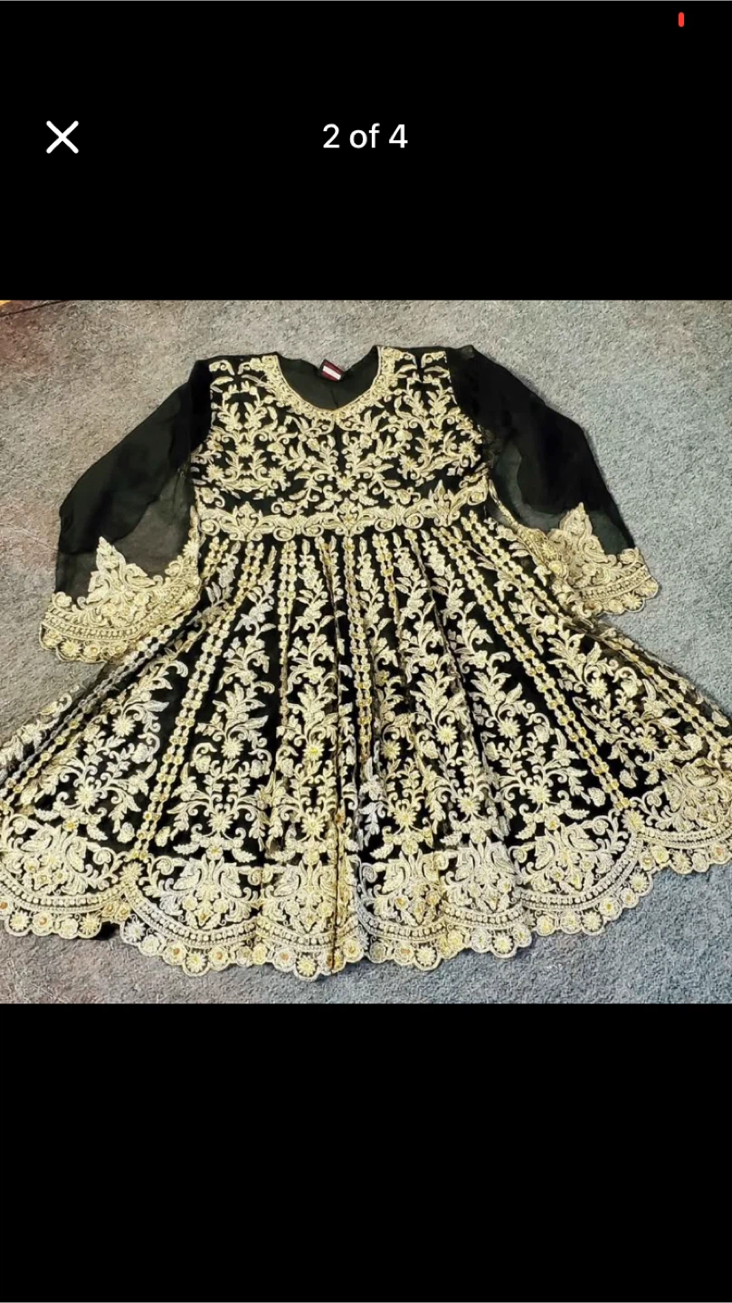 Beautiful Anarkali dress in black with intricate gold embroidery. Perfect for special occasions or adding a touch of elegance to your wardrobe! The dress features sheer sleeves and delicate detailing.