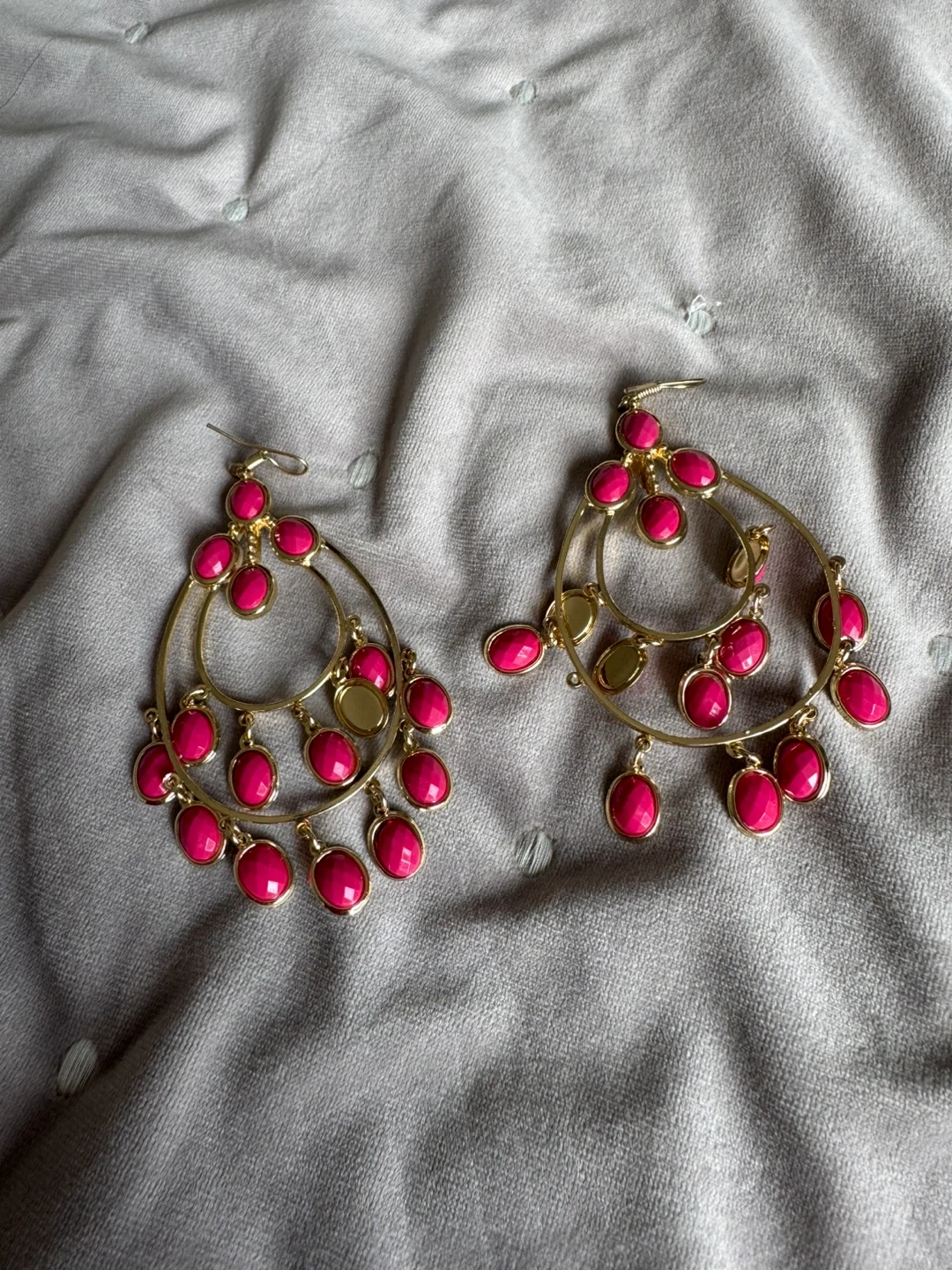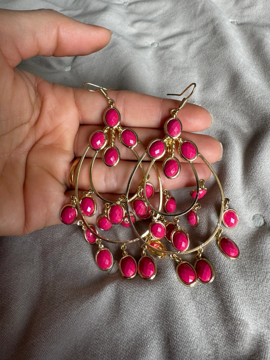 These large chandelier-style earrings have a gold-tone metal frame and multiple strands of small, oval pink beads. They're designed for pierced ears and offer a statement look. The drop length is approximately 3 inches.