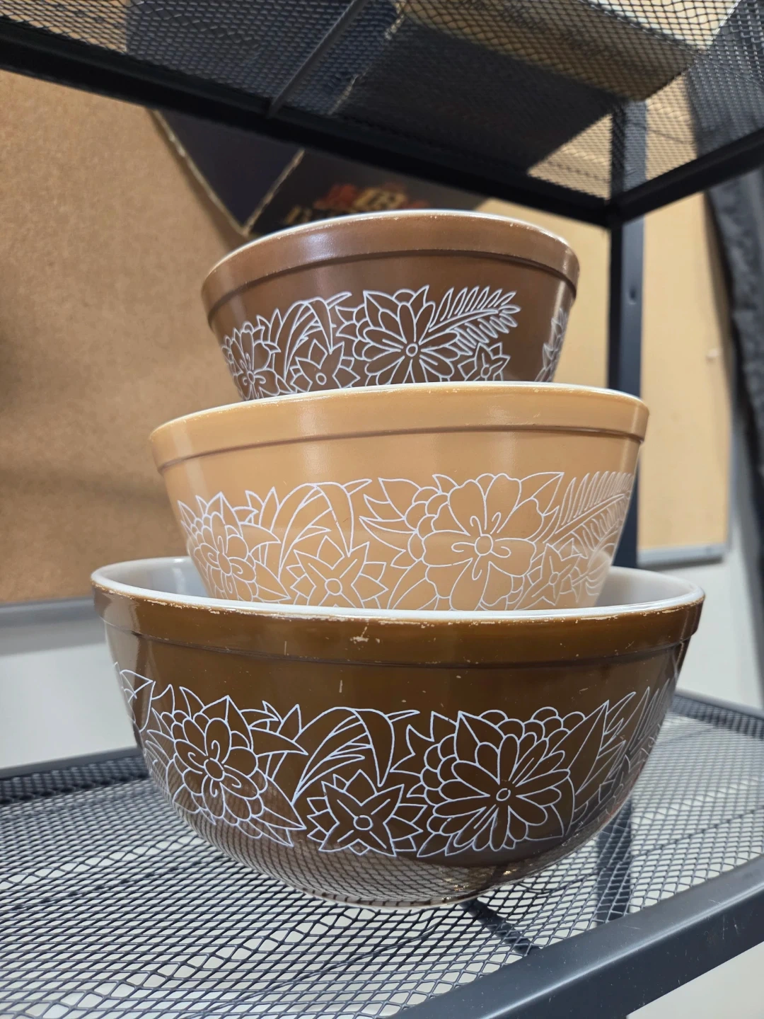 Vintage Pyrex mixing bowls in a lovely brown colour with a white floral pattern. Includes three bowls of varying sizes, perfect for all your kitchen prep needs. Made of durable glass material. Oven safe.