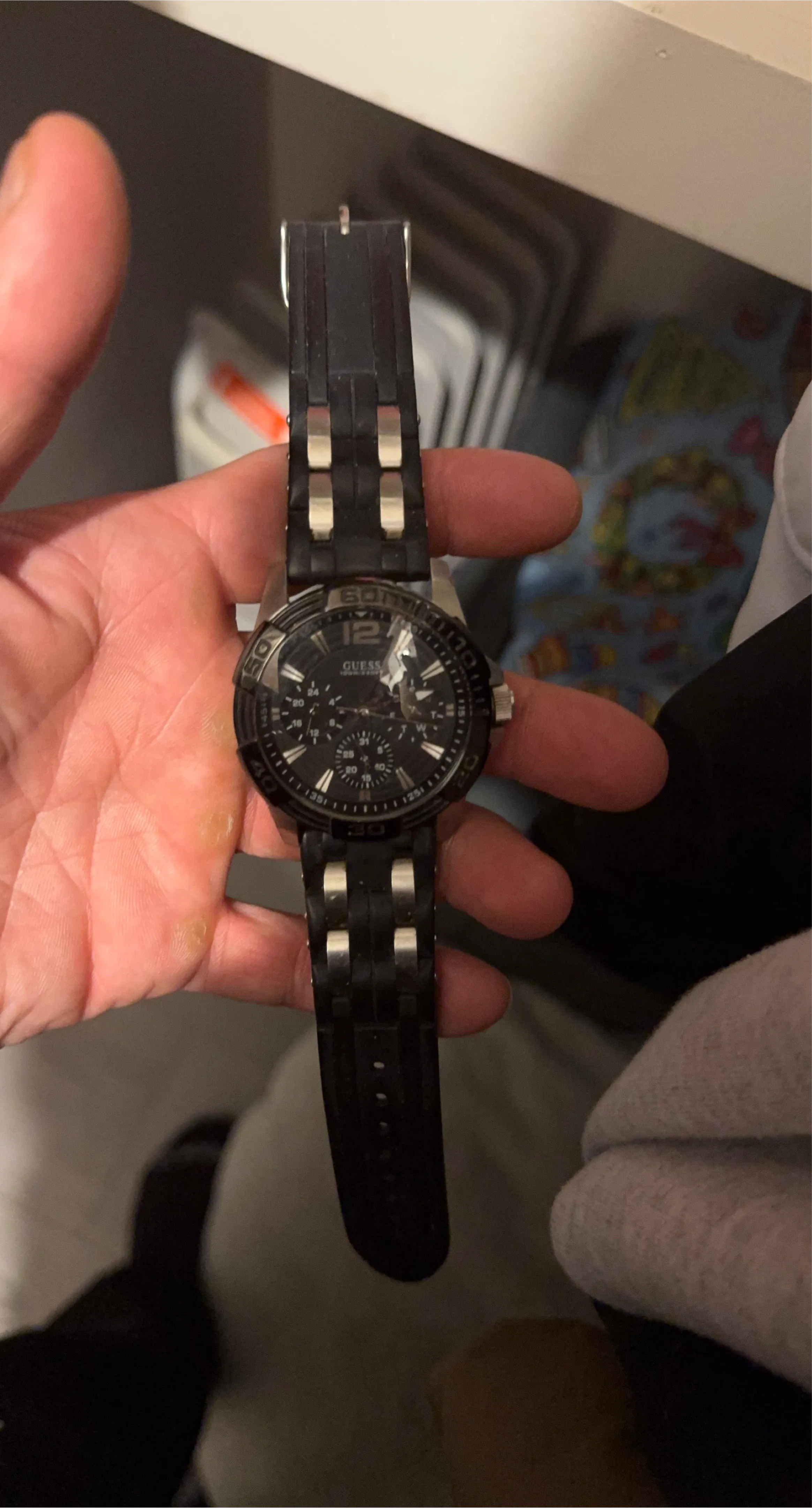 This is a Guess men's chronograph watch with a black rubber strap. It features a black dial with silver-tone accents. The watch has multiple subdials and a date display.