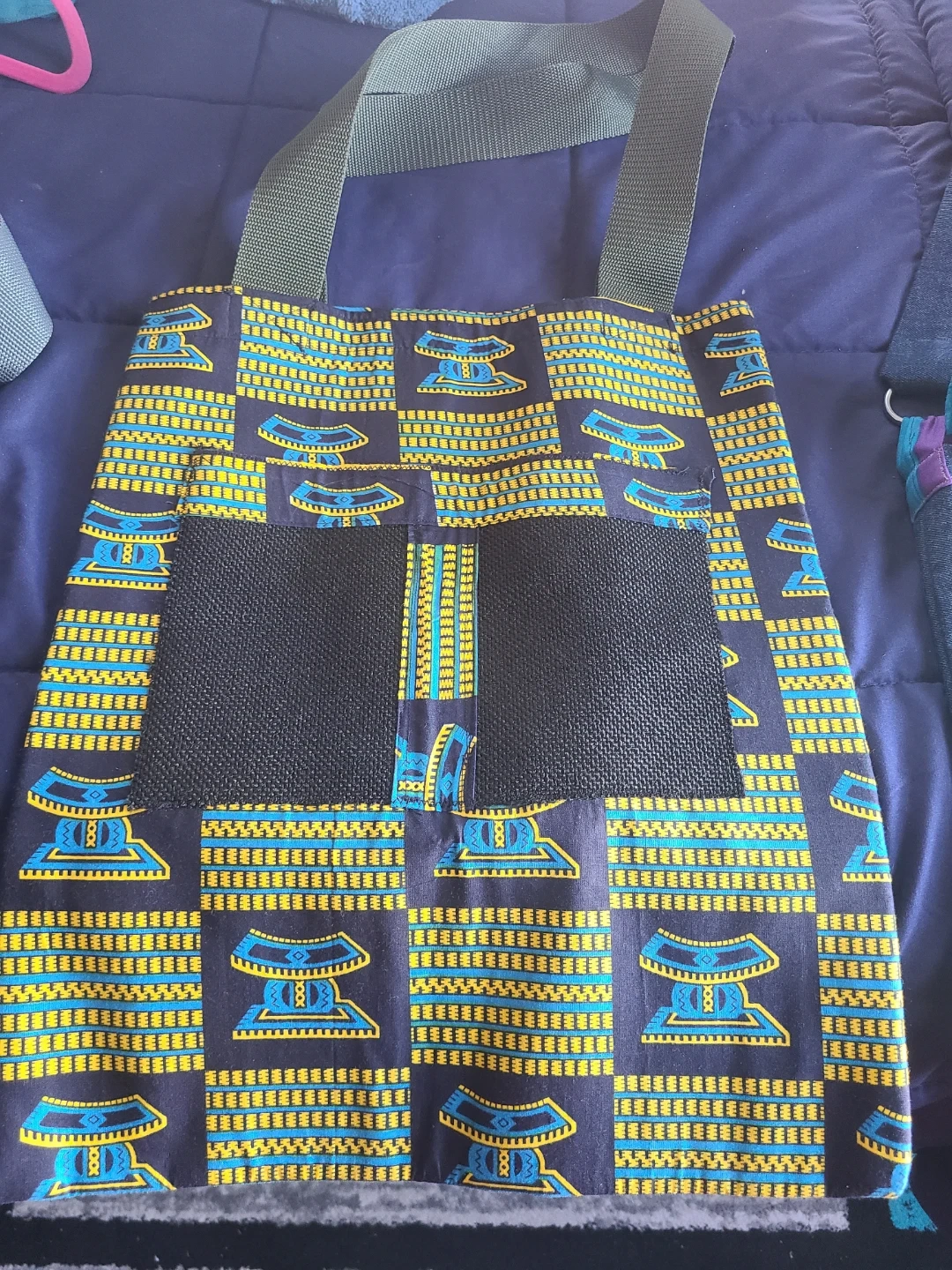 Handmade tote bag featuring two distinct designs: one with a vibrant African wax print and mesh pockets, and another with a cheerful lemon and leaf pattern. Sturdy handles make it easy to carry. This bag is perfect for groceries, beach trips, or everyday use!