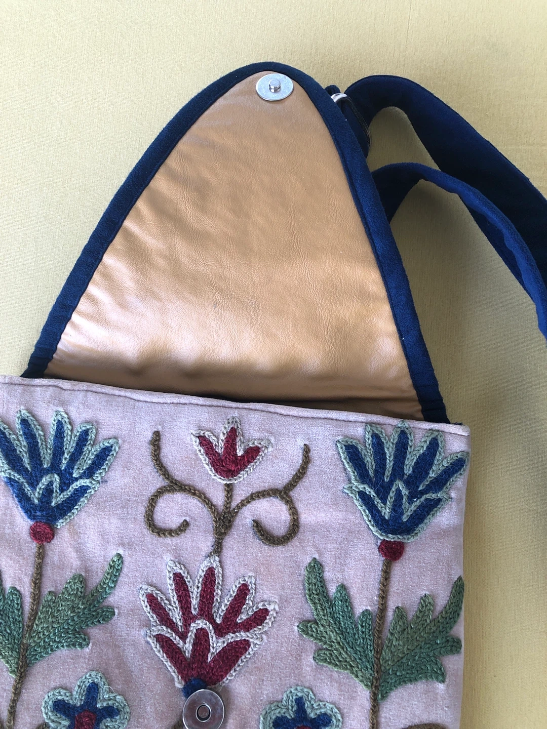 This light pink shoulder bag features intricate floral embroidery in blue, green, and red (Kashmiri) It has a navy blue trim and strap. The interior has one zippered pocket and a magnetic snap closure. Check out my other postings, Combo deals and great discounts when purchasing 2 or more items.
