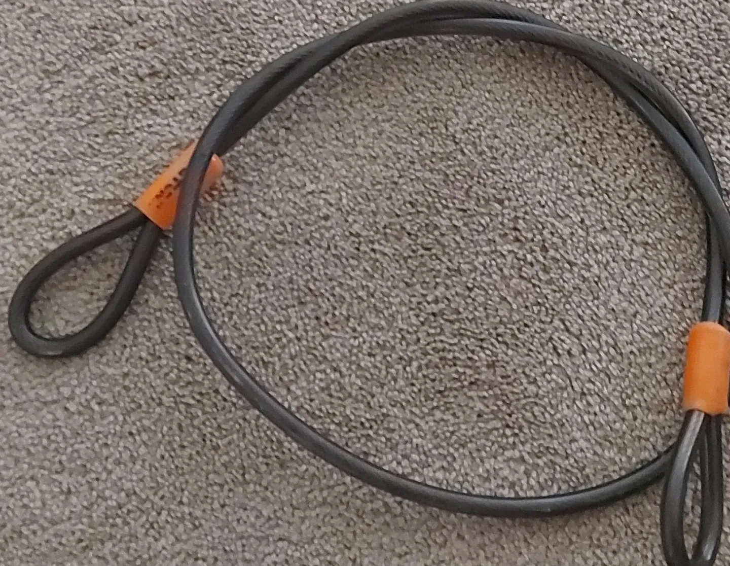 This is a cable lock. It's made of a strong steel cable with a vinyl coating. It has two loops for securing items.
