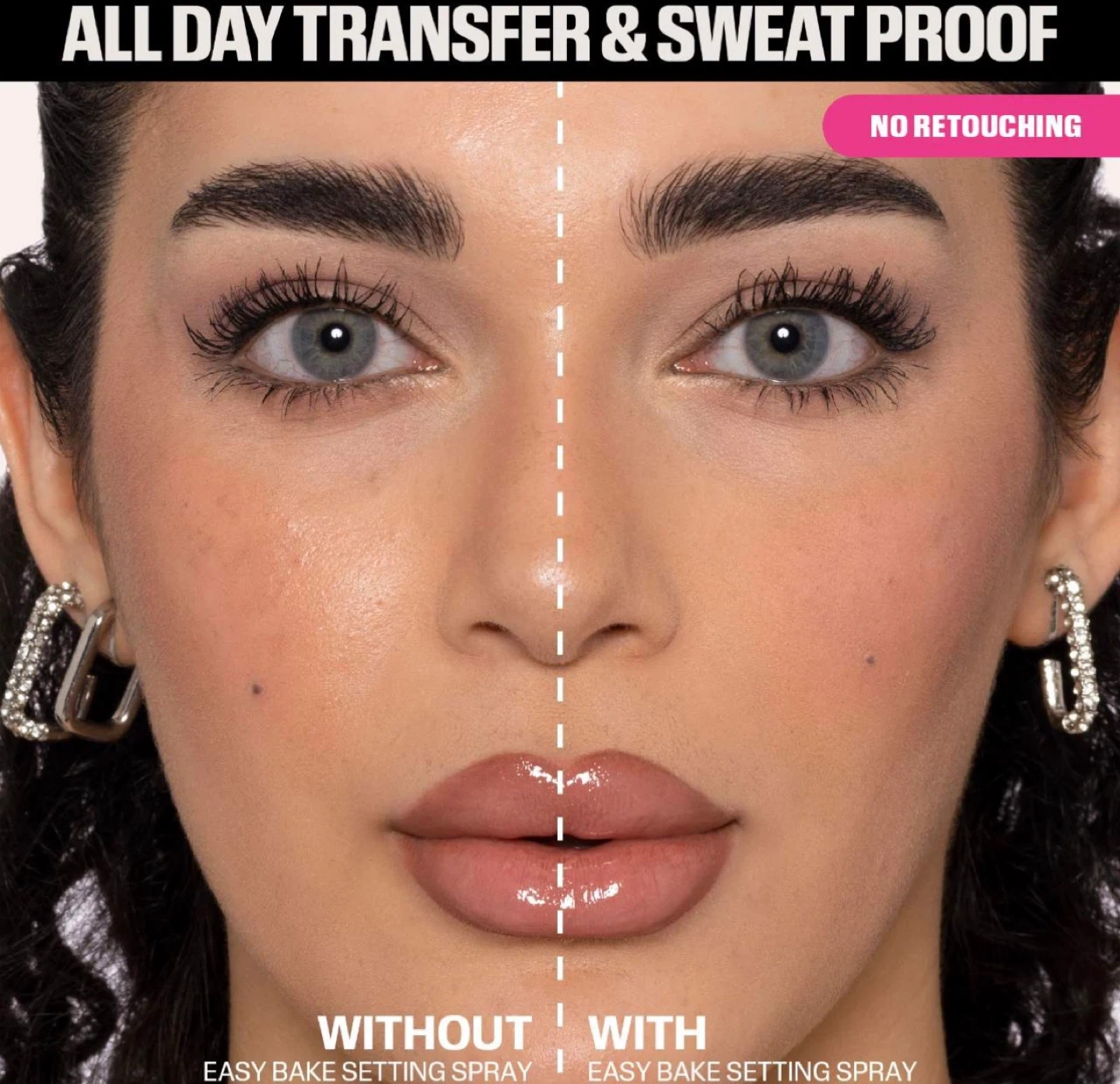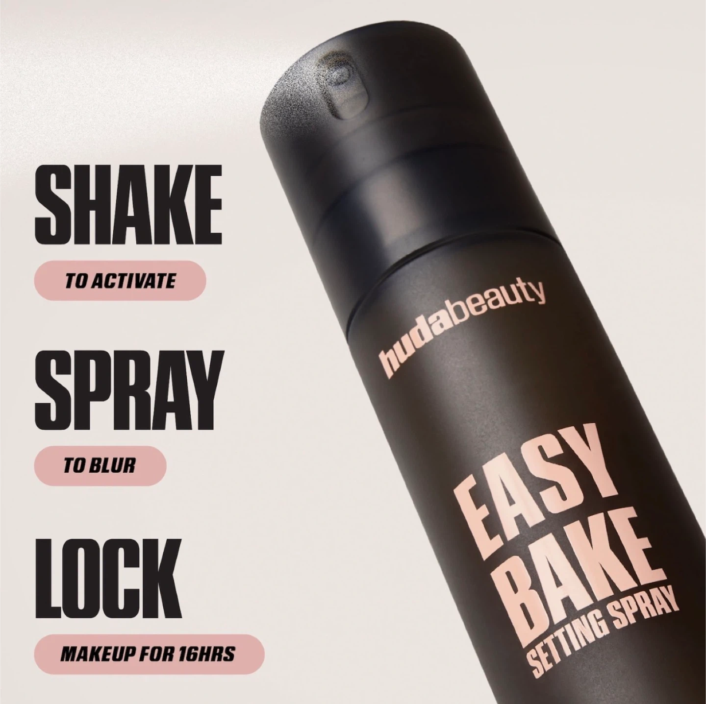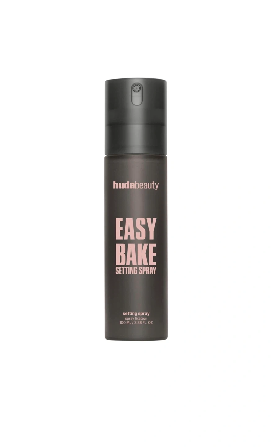 Selling Huda Beauty Easy Bake Setting Spray. This formula offers all-day transfer and sweat proof makeup, locking it in for 16 hours. Shake to activate and spray to blur for a flawless finish. A must-have for your makeup bag!