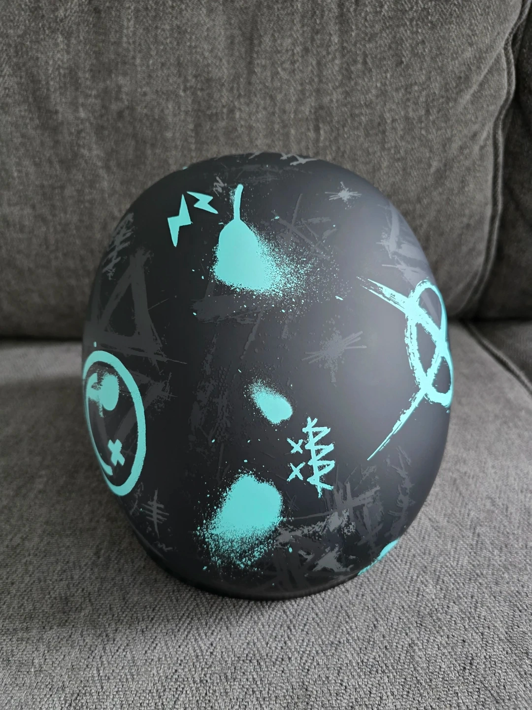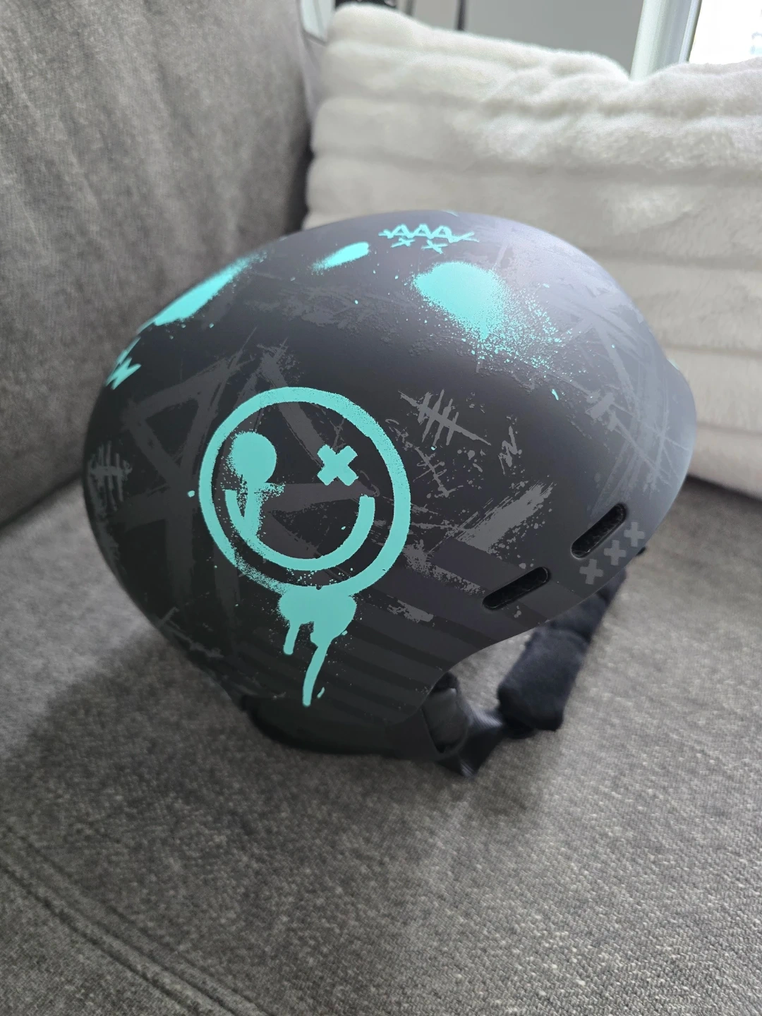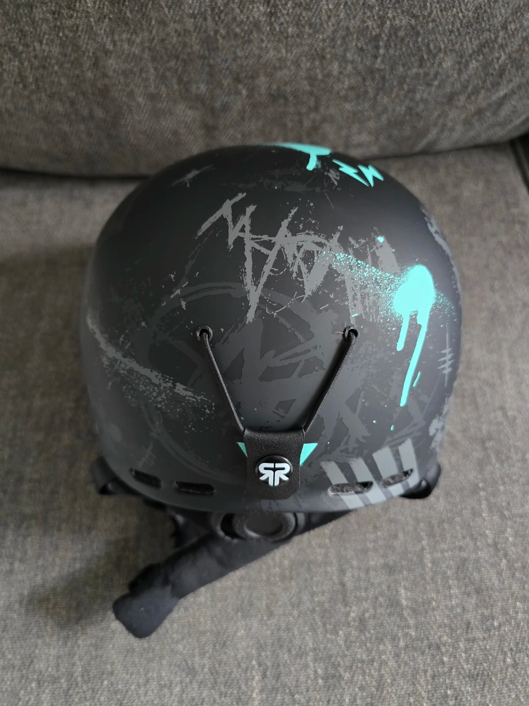 This RuRoc Renegade helmet comes in black with a cool teal graffiti design. It's built for skiing and snowboarding. It has adjustable ventilation and a dial-fit system for a comfy fit. Perfect for hitting the slopes!