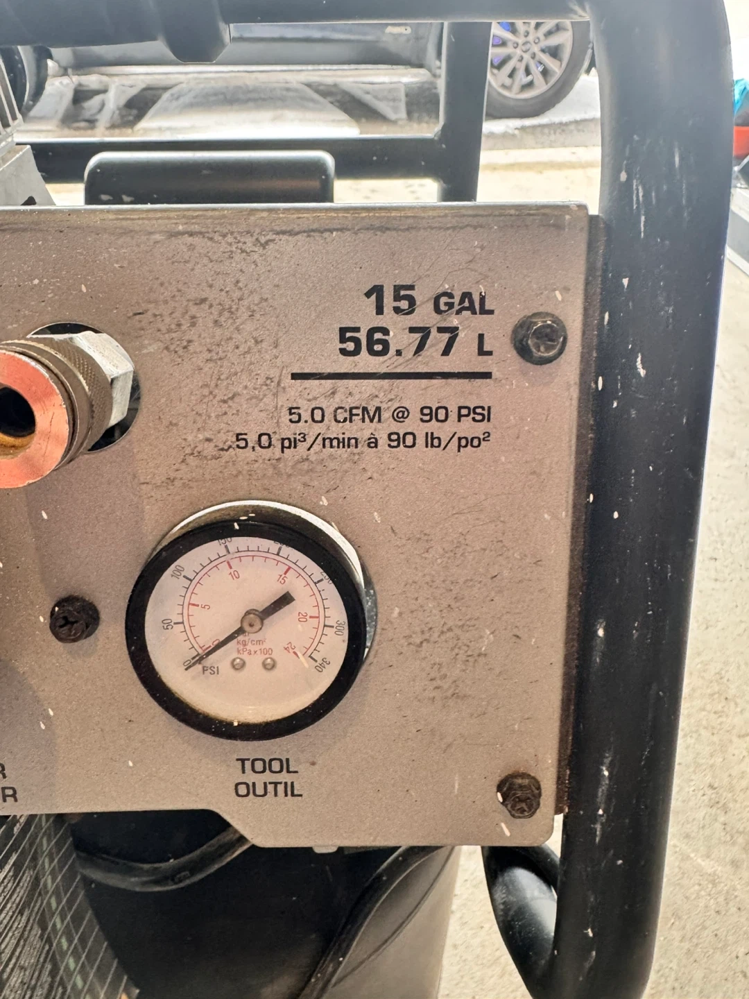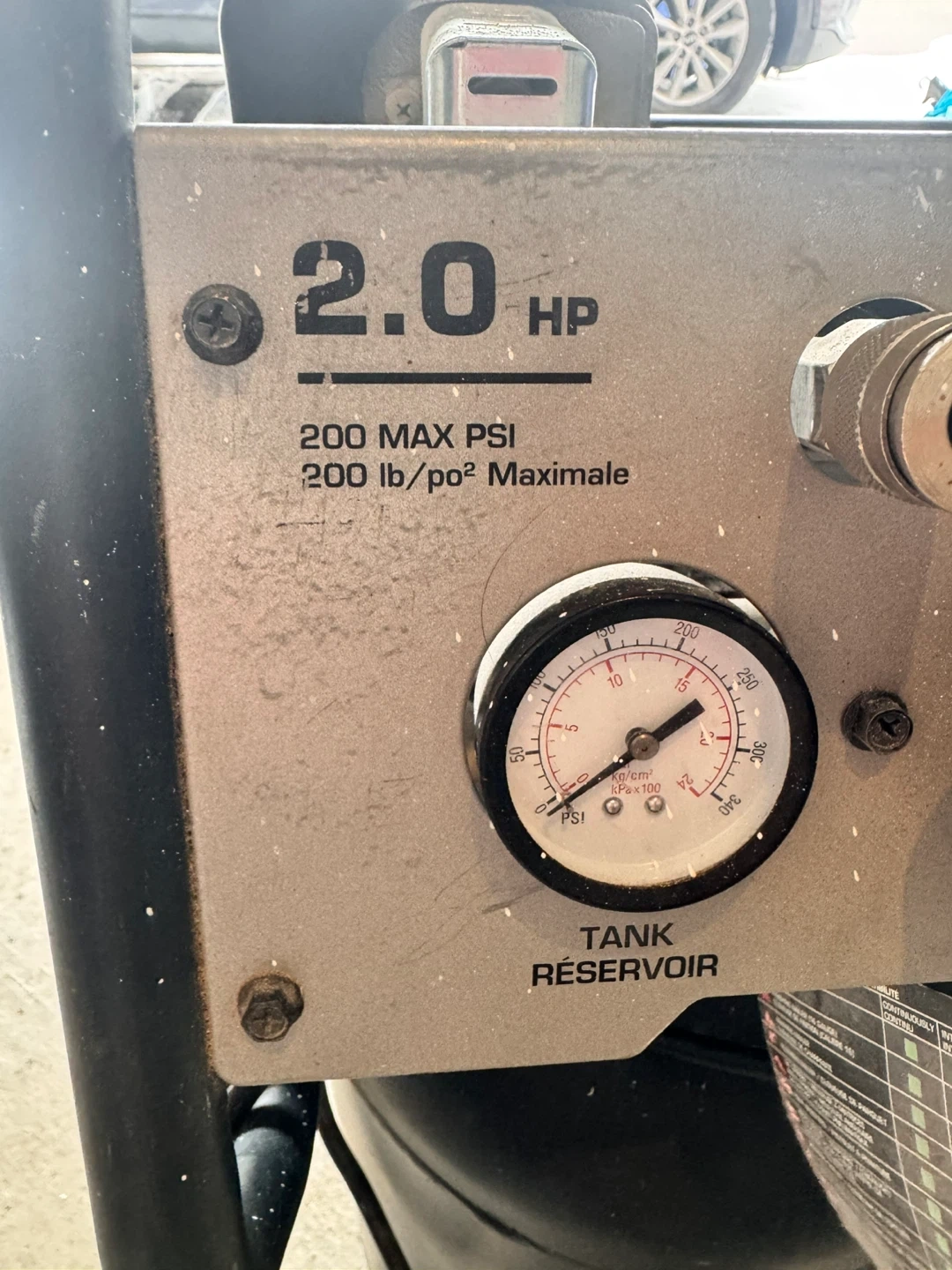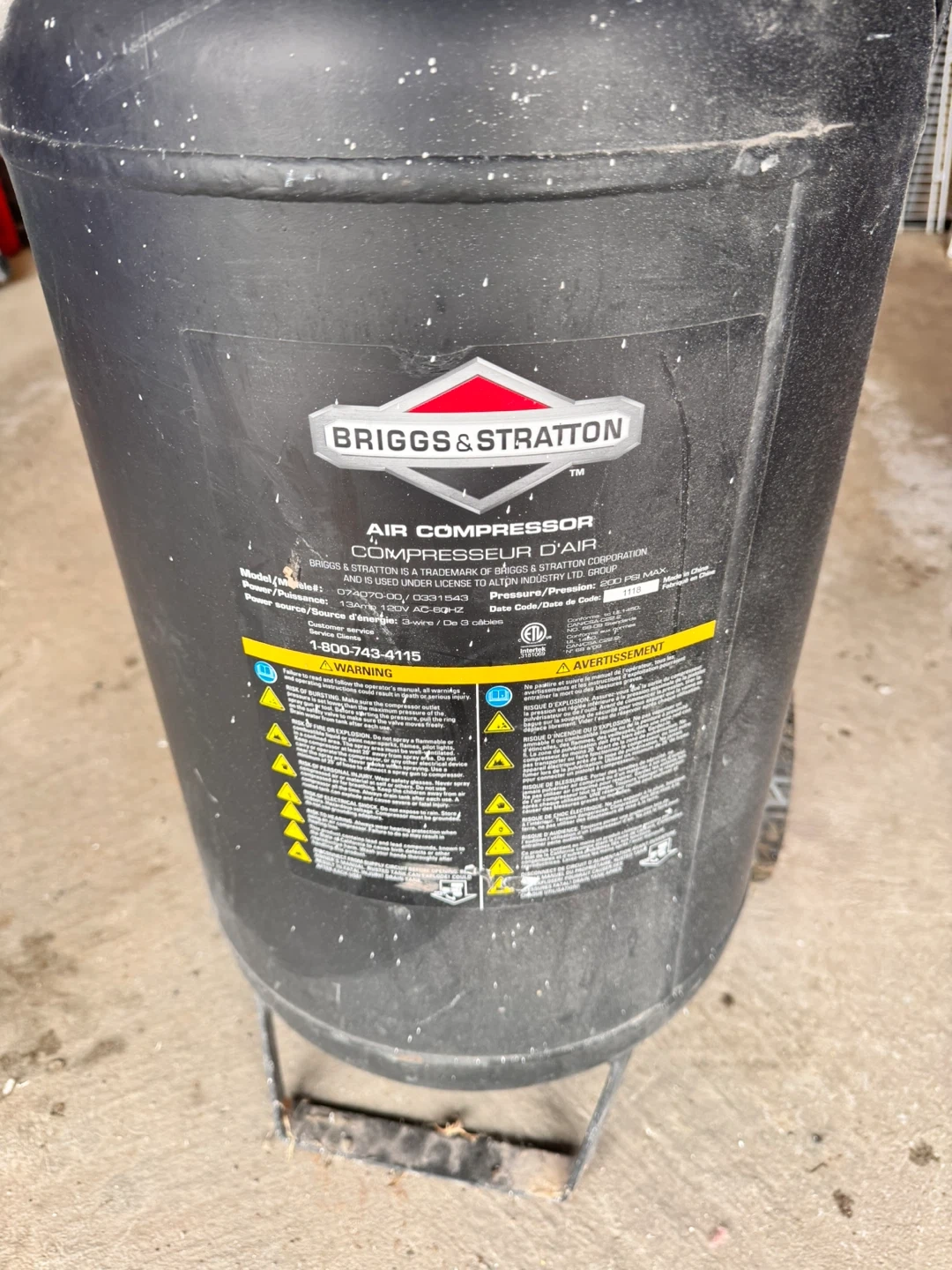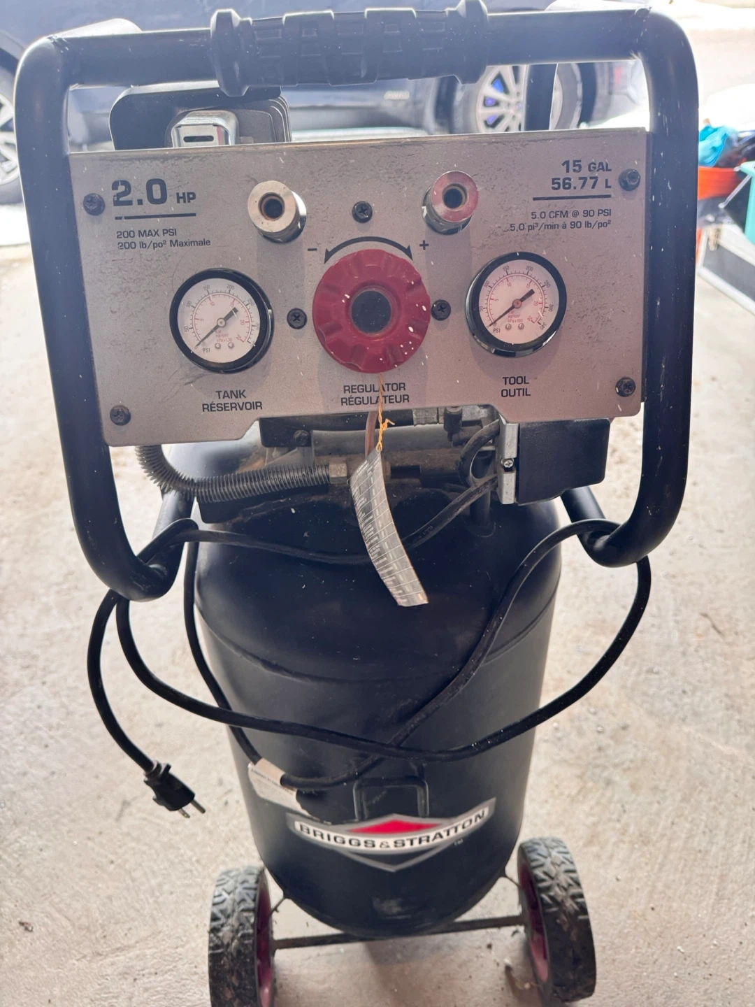 This is a Briggs & Stratton 15 gallon air compressor with 2.0 HP. It has a maximum pressure of 200 PSI and 5.0 CFM at 90 PSI. It's ideal for various workshop tasks.