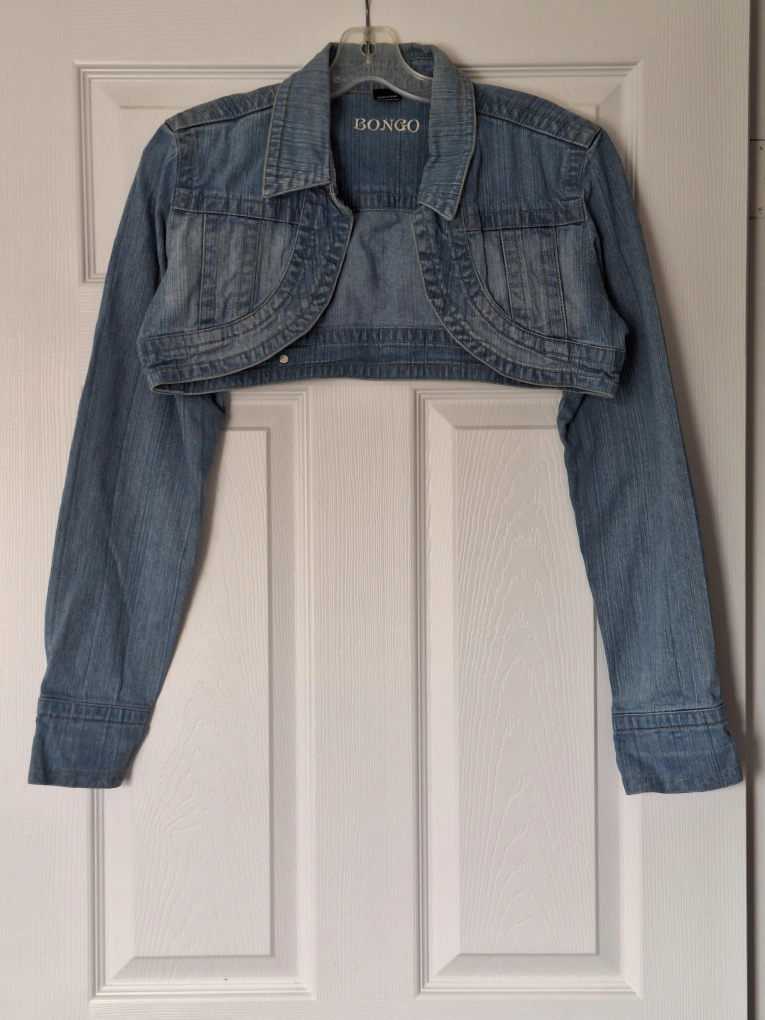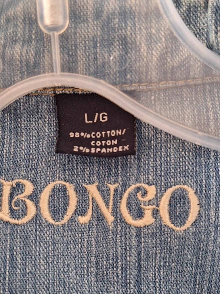 Selling a Bongo denim bolero jacket in size large. It's made of 98% cotton and 2% spandex. This cute jacket is perfect for layering! can fit a medium size as well. it great as it is already cut off !!!