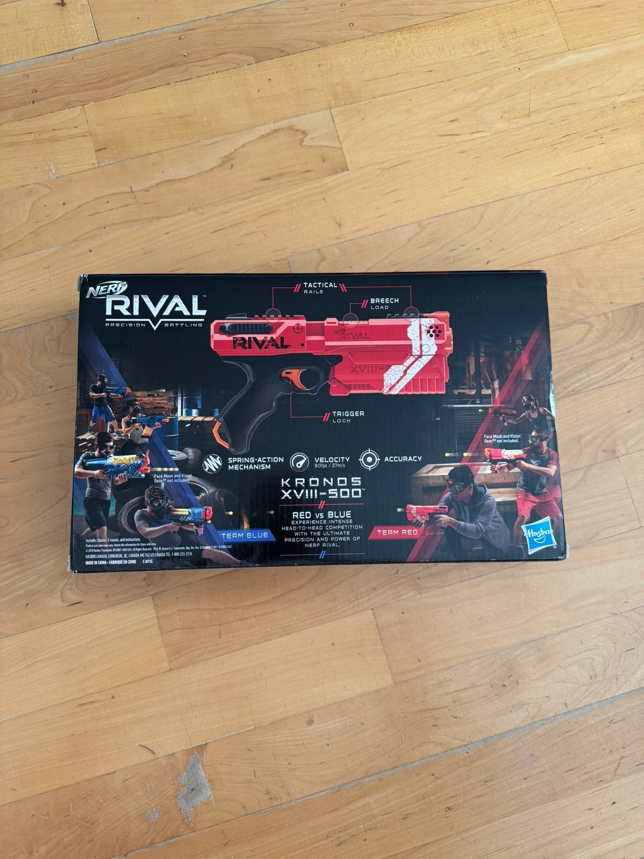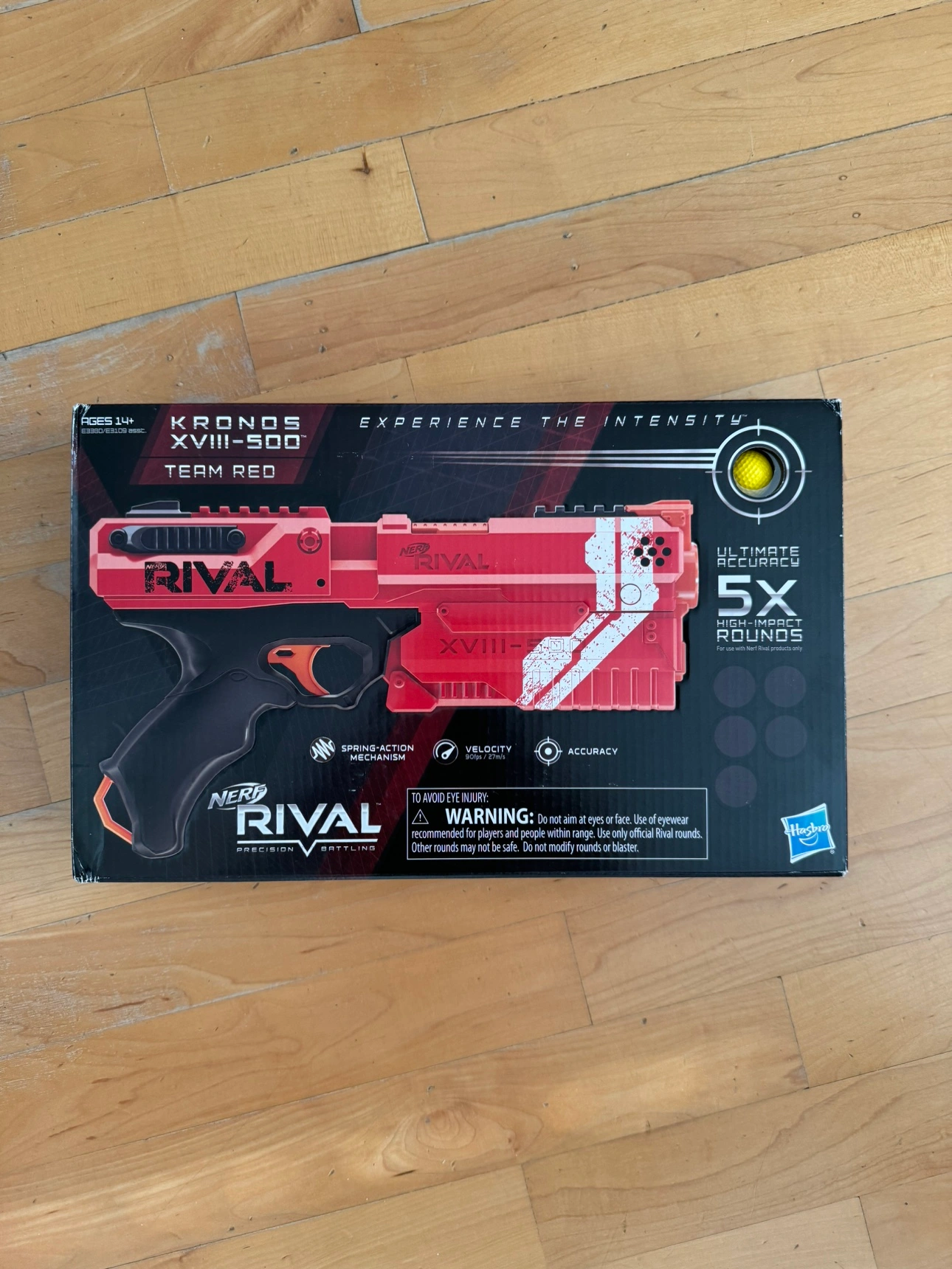 This is a red Nerf Rival Kronos XVIII-500 blaster. It comes in the original packaging. It has a spring-action mechanism, a tactical rail, and a breech load. It features a high impact round and ultimate accuracy.