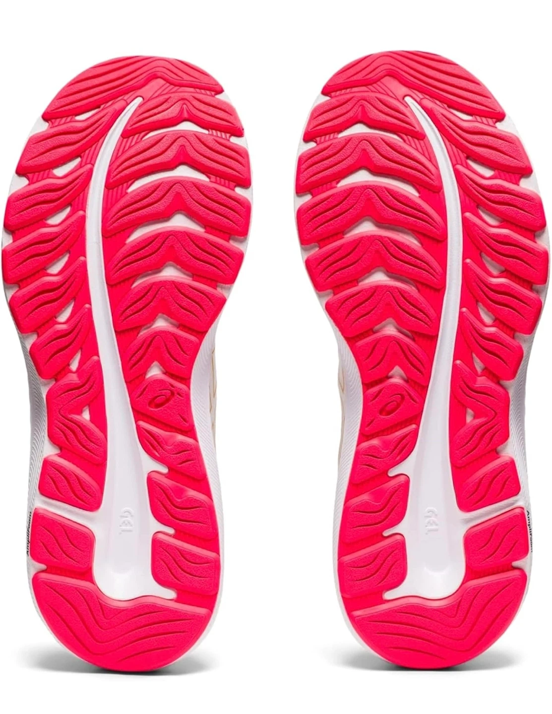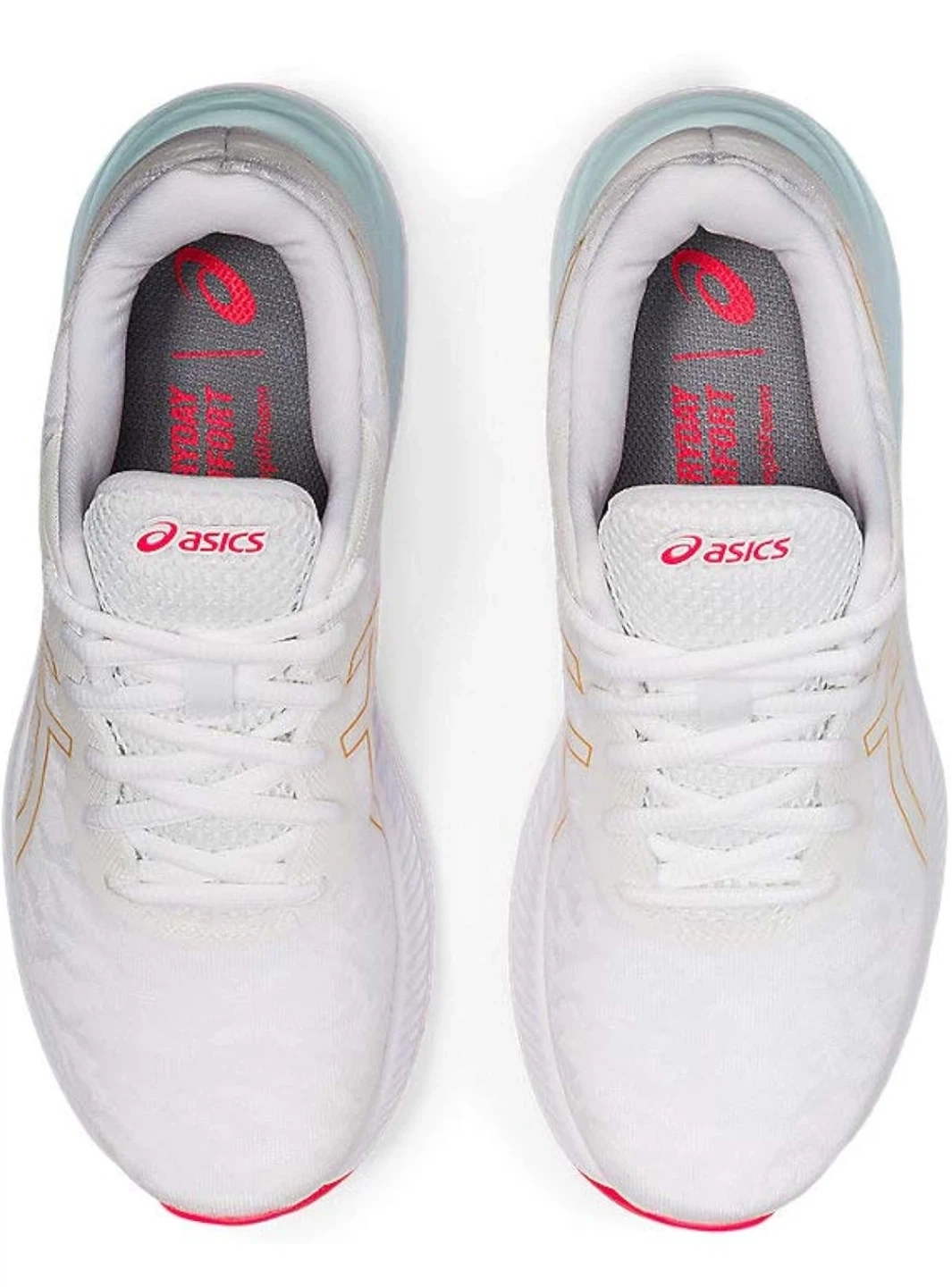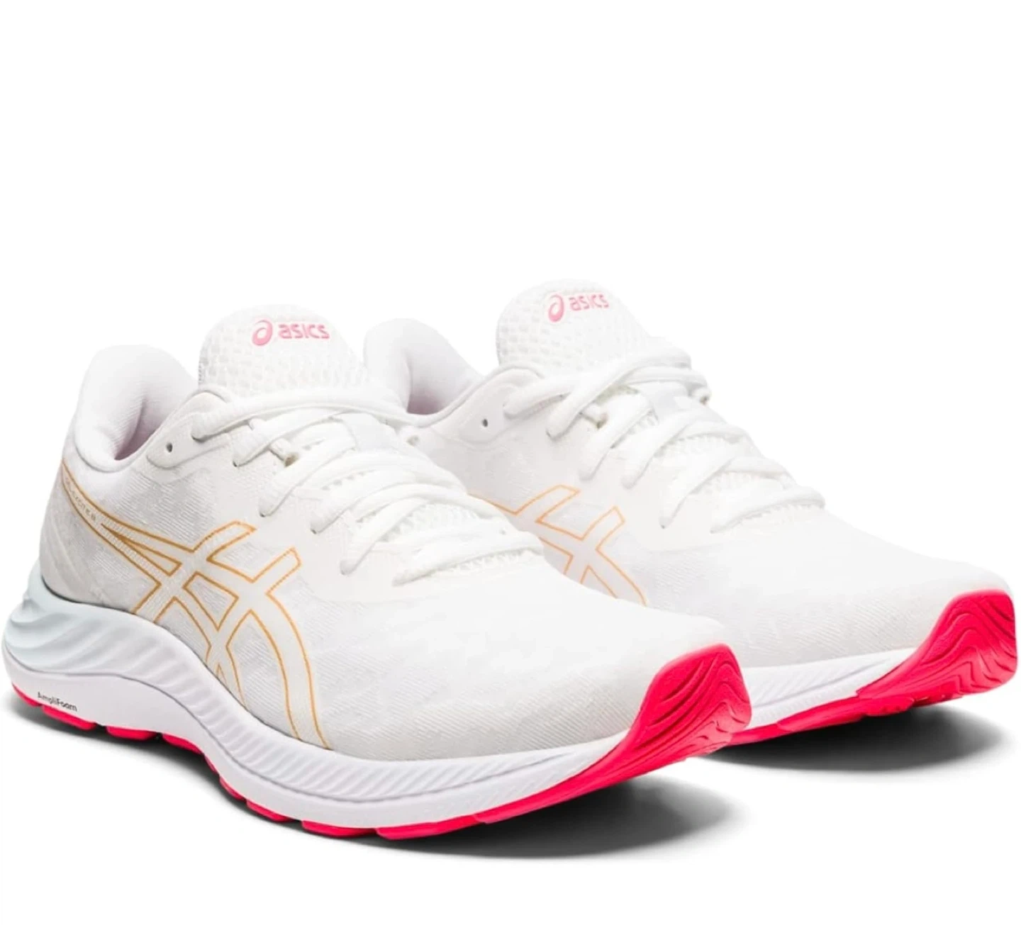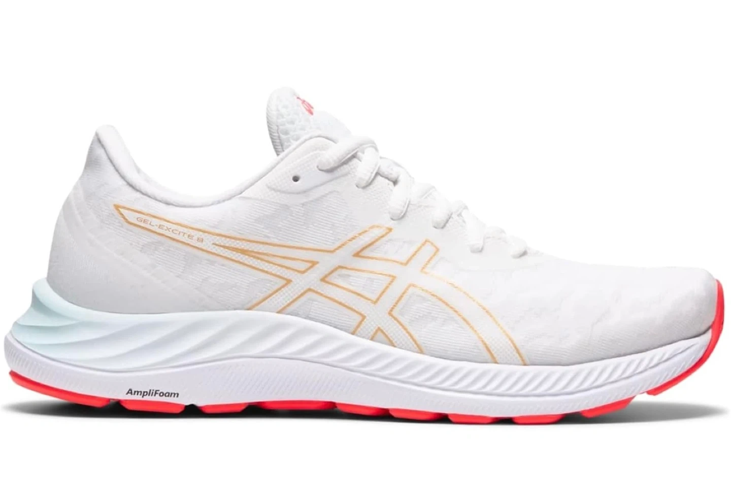 ASICS Gel-Excite 9 running shoes in white with gold accents. Features AMPLIFOAM cushioning and GEL technology for comfort. Breathable mesh upper with a durable rubber outsole. Excellent for daily runs or training!