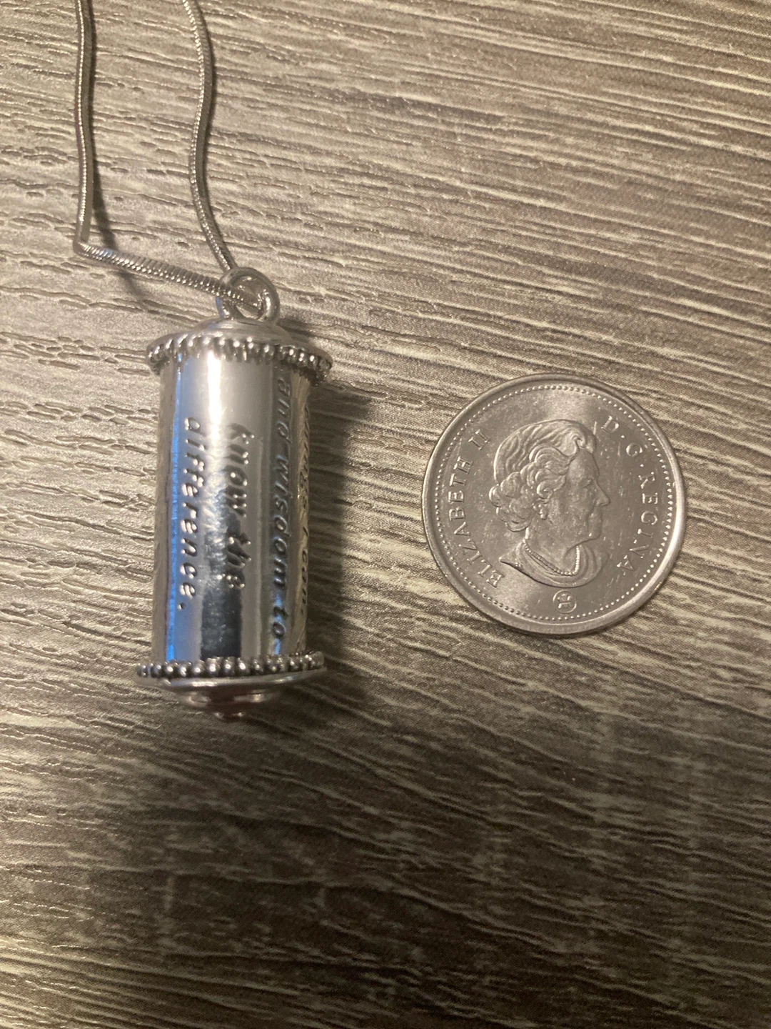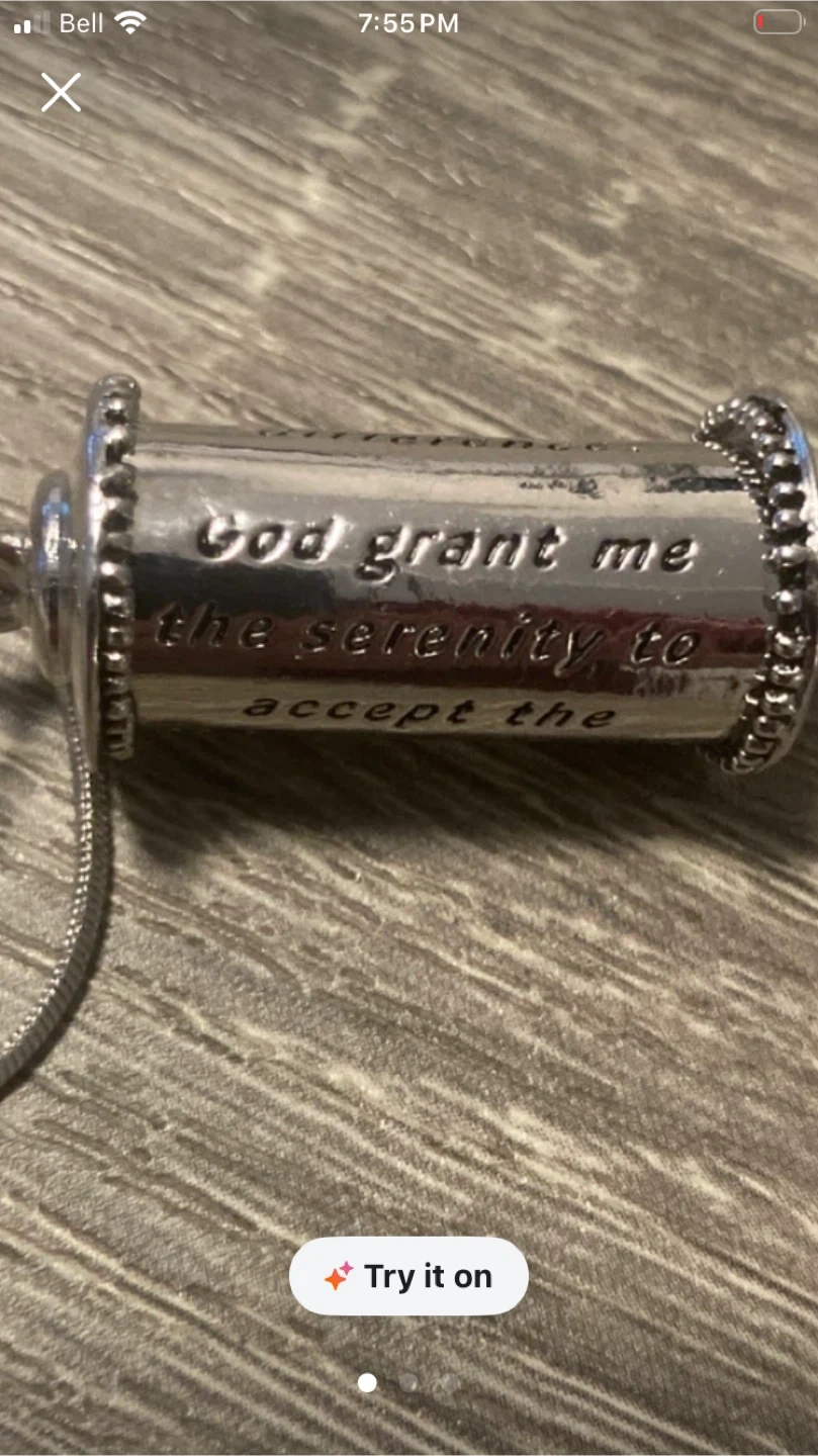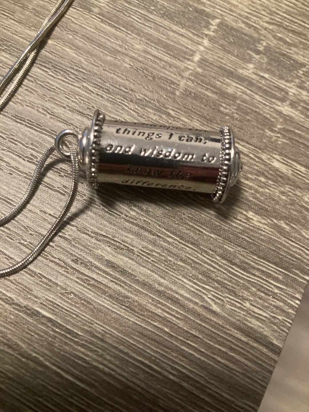 This silver-tone pendant necklace features the serenity prayer etched onto it. It's a unique piece with a meaningful message. The chain is a snake style.