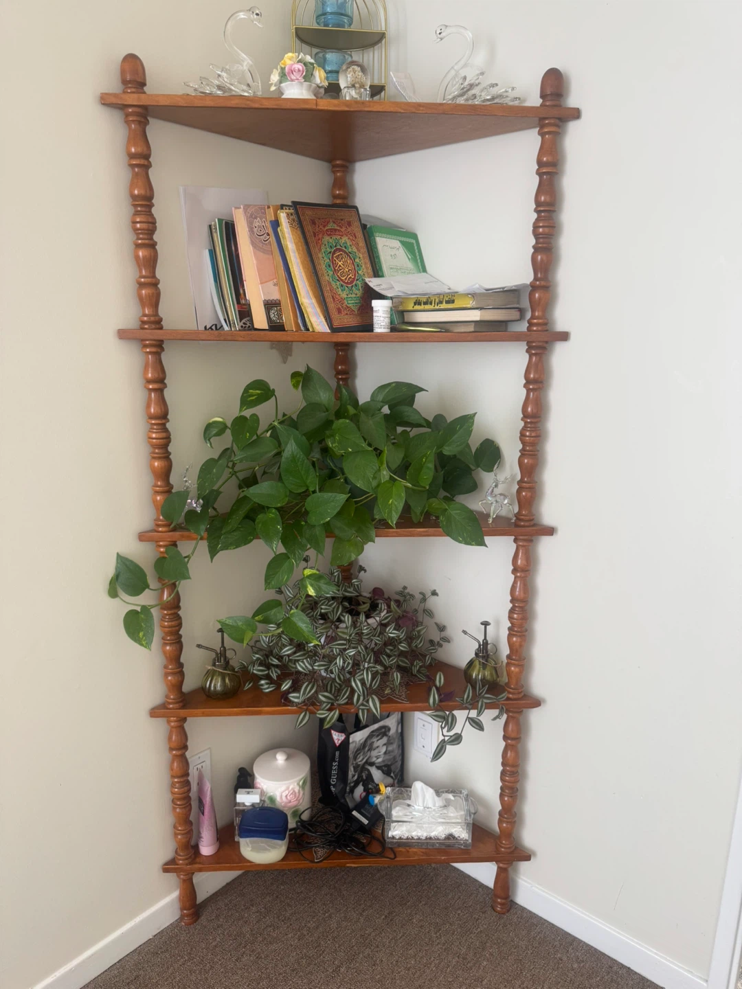 Selling a wooden corner shelf. It's in good condition and ready to use. Perfect for displaying plants, books, or other decorative items in a corner space