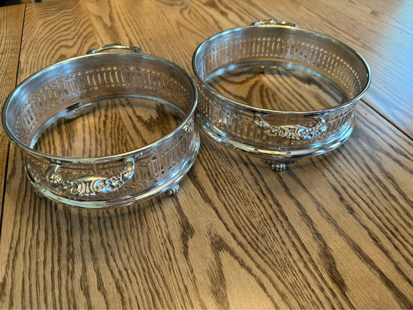 Two ornate silver plate trays with decorative handles and pierced sides. They're elevated on small, rounded feet. Perfect for serving small dishes or as decorative accents. 8” and 7” diameters