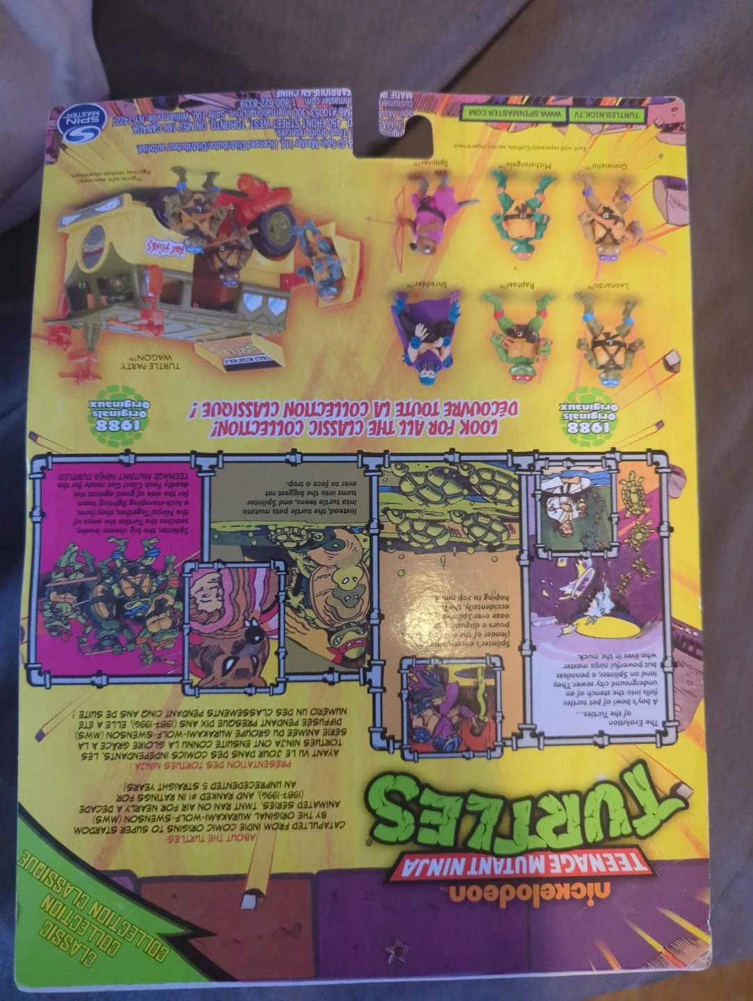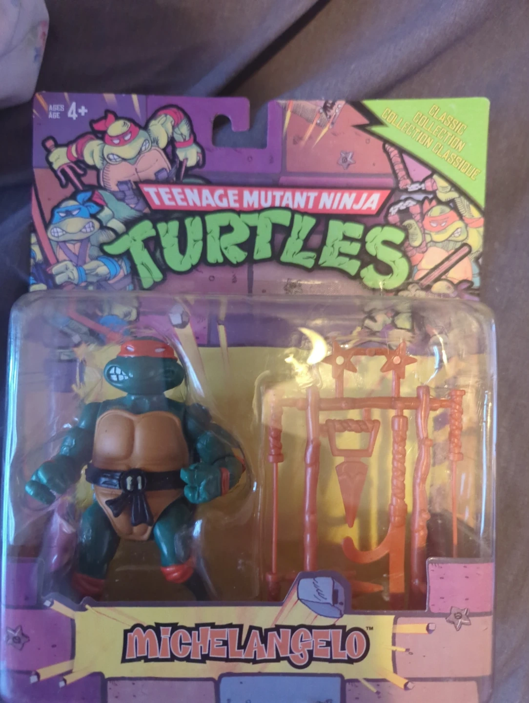 Selling a Teenage Mutant Ninja Turtles Michelangelo action figure from the Classic Collection Classique series. The packaging indicates it's suitable for ages 4+ misprint