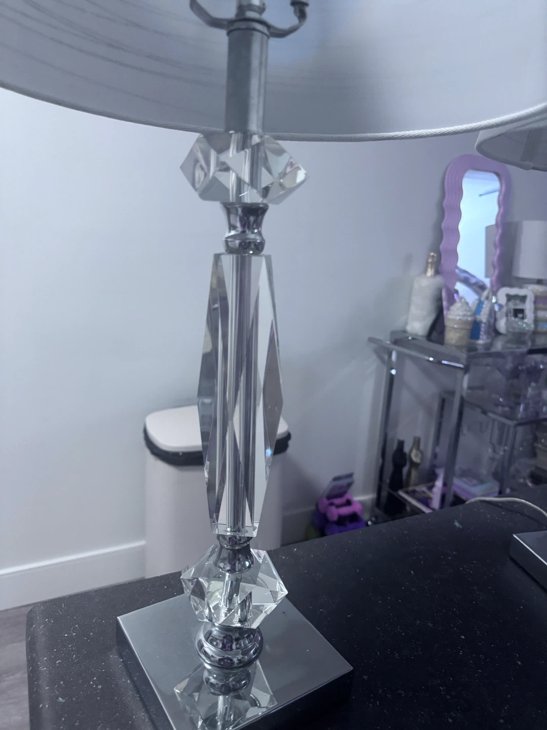 Selling a set of two crystal table lamps! Originally purchased from HomeSense last year for $89 apiece. They're in great shape and would look lovely in any room. The lamps stand about 17 inches tall. They have a striped pattern on the lamp shade and a crystal design on the base. I inserted two lightbulbs to ensure that they both work one cool lightbulb, and one warm lightbulb both at 60 W. Lamb shades can also be removed.