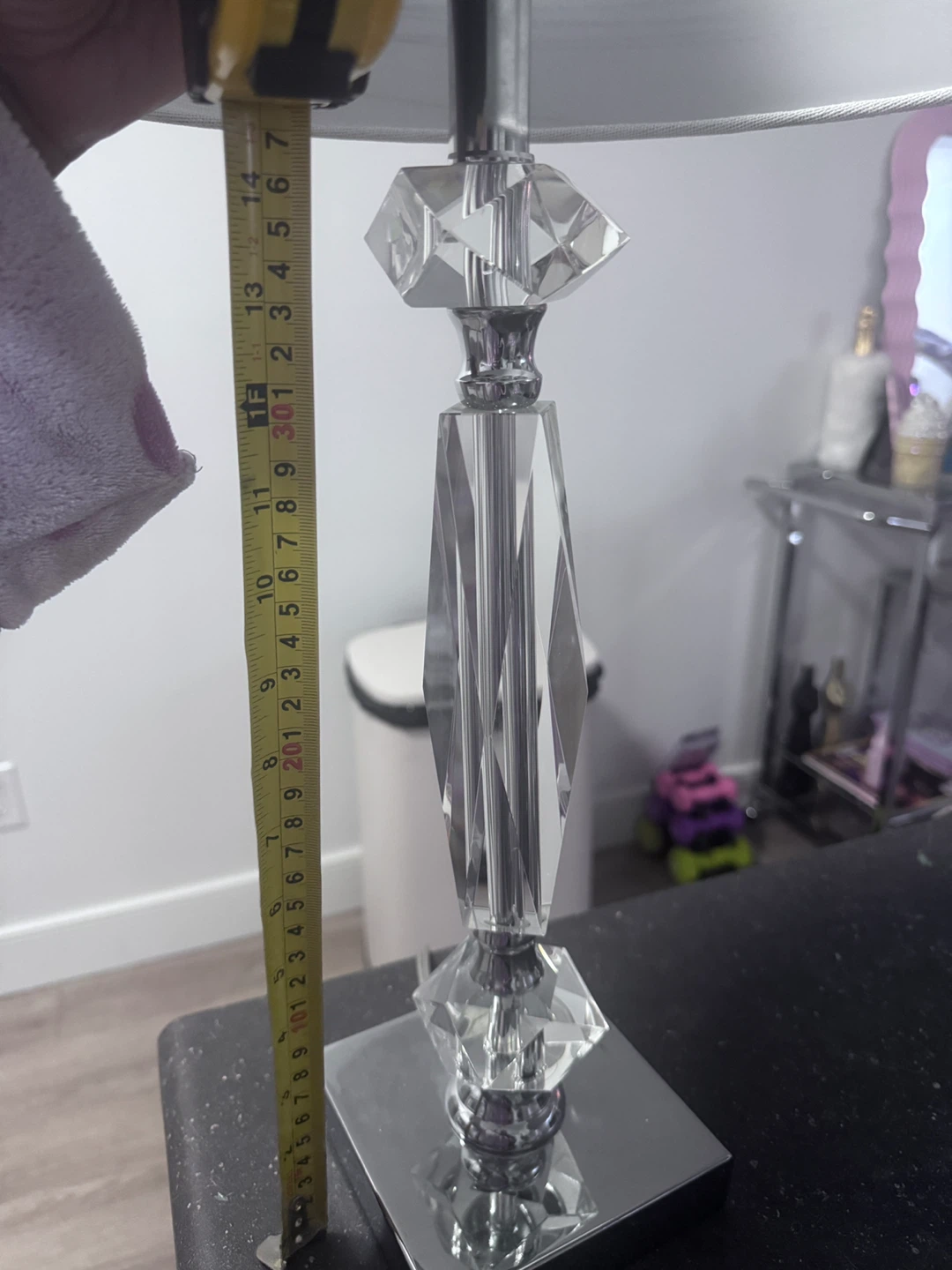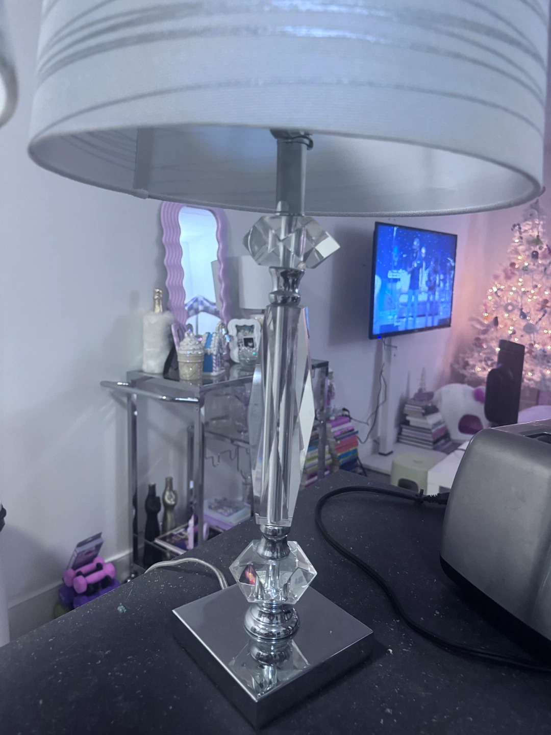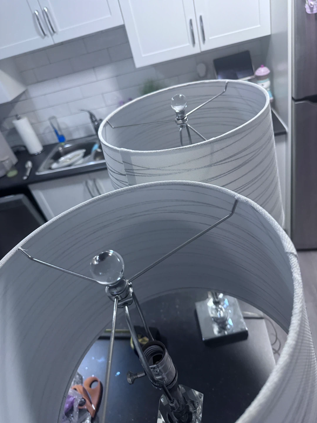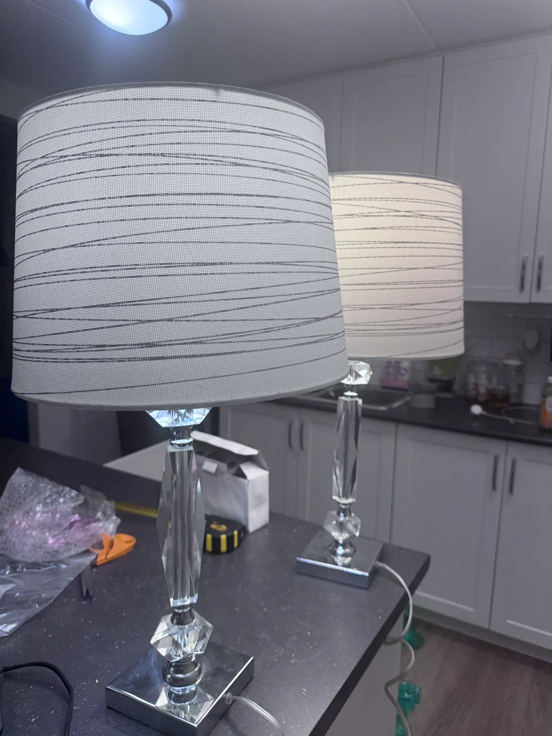 Selling a set of two crystal table lamps! Originally purchased from HomeSense last year for $89 apiece. They're in great shape and would look lovely in any room. The lamps stand about 17 inches tall. They have a striped pattern on the lamp shade and a crystal design on the base. I inserted two lightbulbs to ensure that they both work one cool lightbulb, and one warm lightbulb both at 60 W. Lamb shades can also be removed.