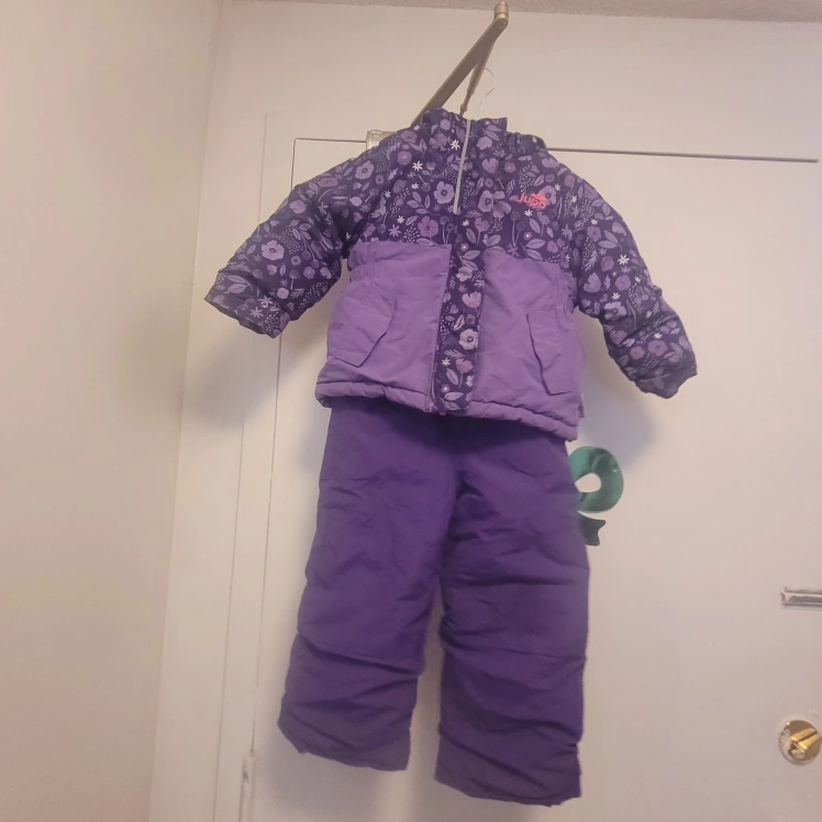 A super cute Jupa snowsuit in purple with a floral pattern! It's in great condition and ready for some winter fun. Size 3