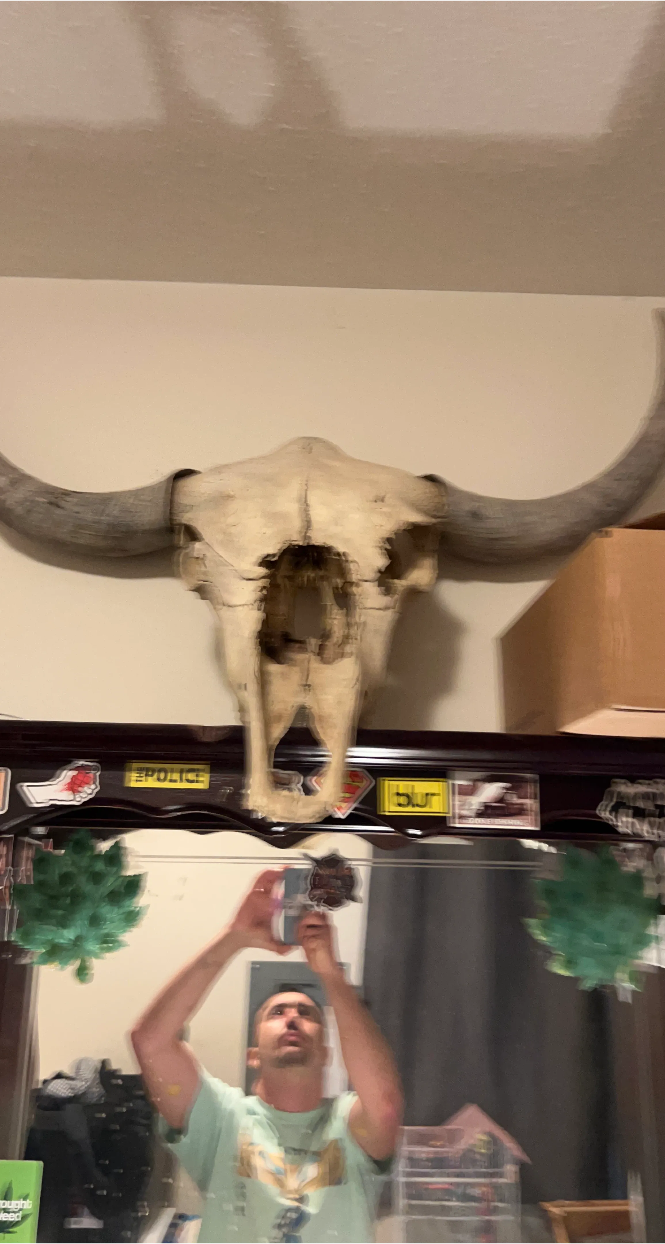This is a real bull skull with impressive, wide-reaching horns. It's a striking piece of decor that adds a rustic or western vibe to any space. It's made of bone and measures approximately 3 feet from horn tip to horn tip. This skull would look great mounted on a wall.