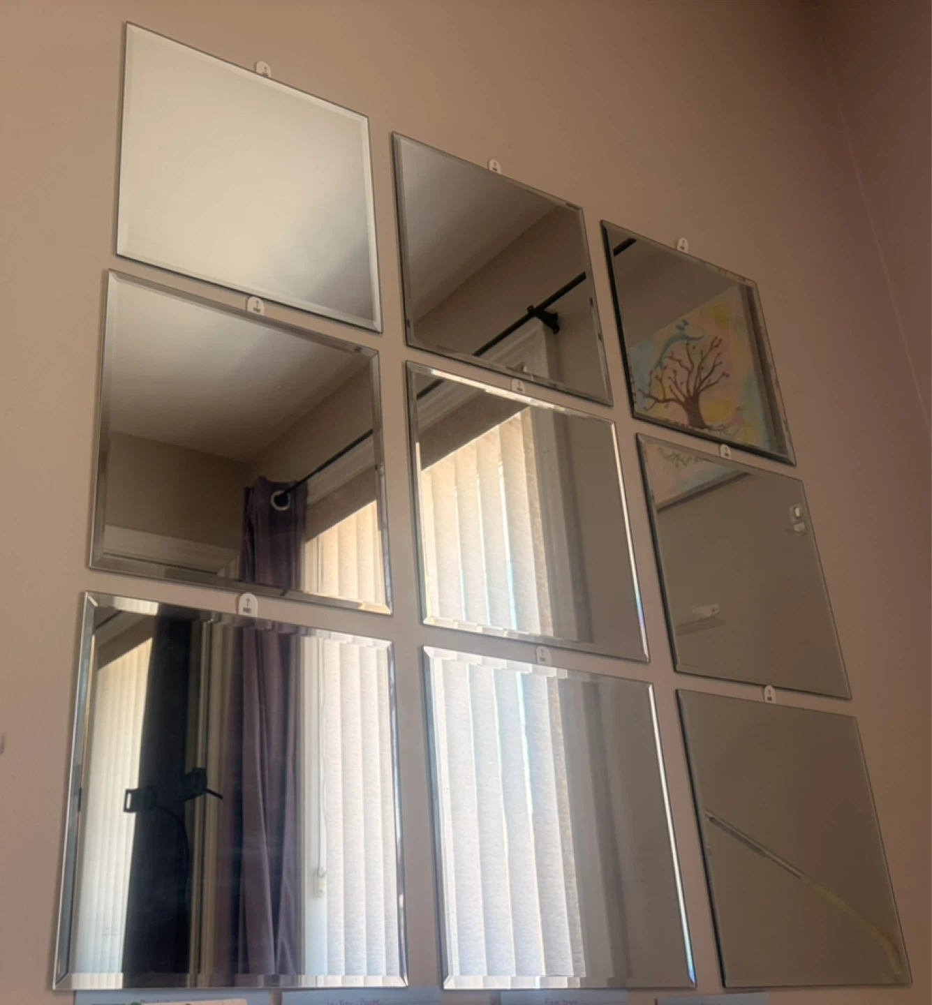 Nine square decorative mirrors with a bevelled edge. Some minor cosmetic damage in one of them, as seen in the second photo
