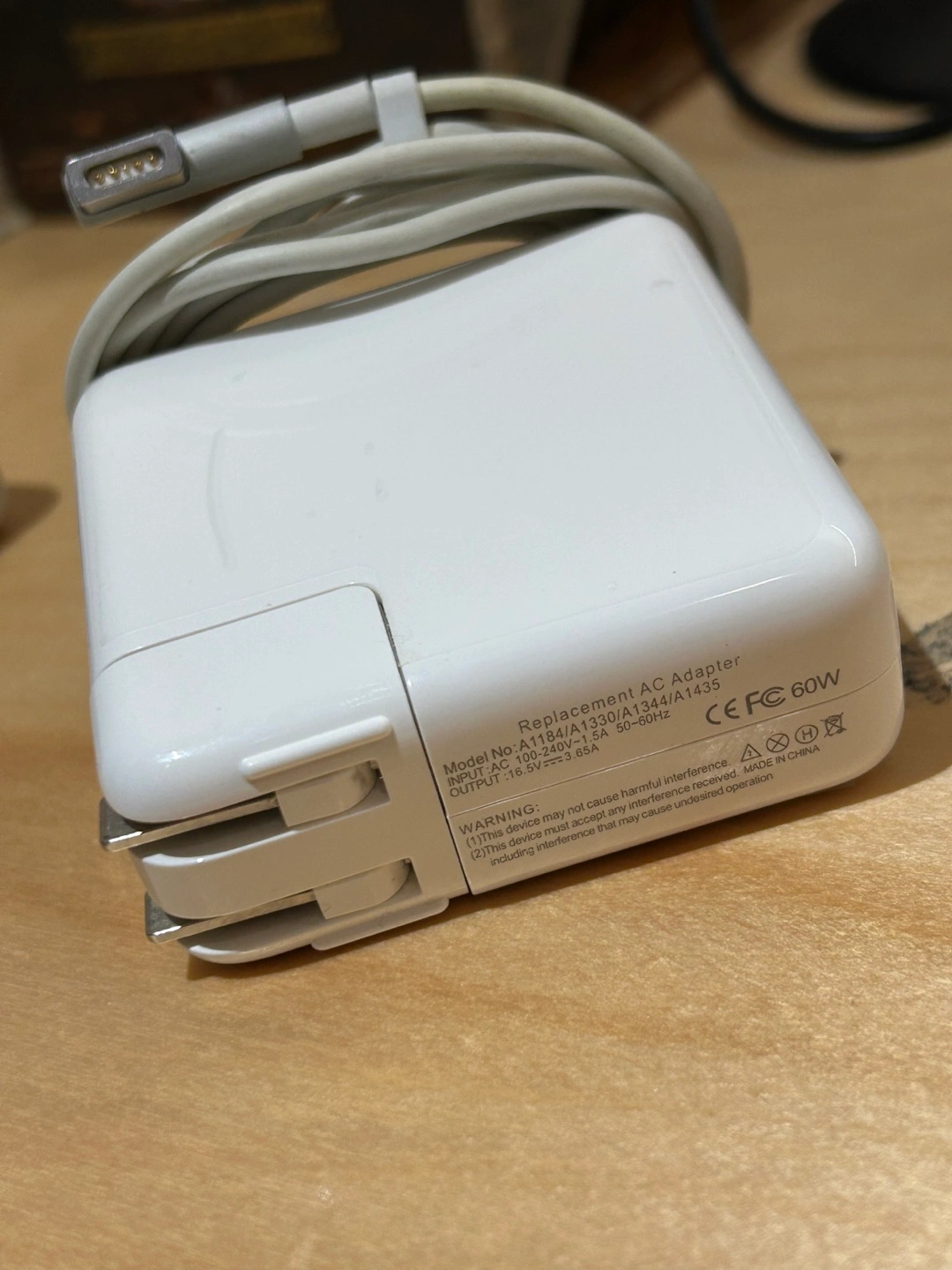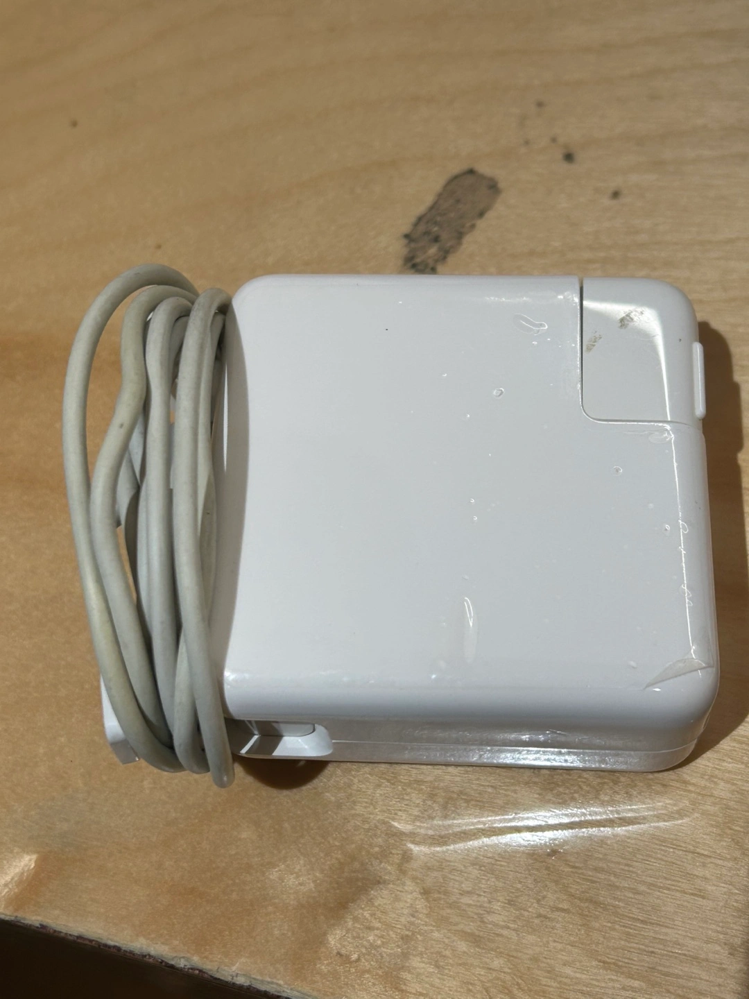 White 60W MagSafe Power Adapter for older MacBook models. Includes power cable. Used but in good condition.