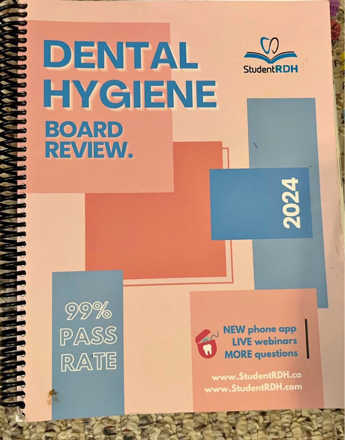 This is the 2024 Dental Hygiene Board Review book. It claims a 99% pass rate. It also mentions a new phone app, live webinars, and more questions available.