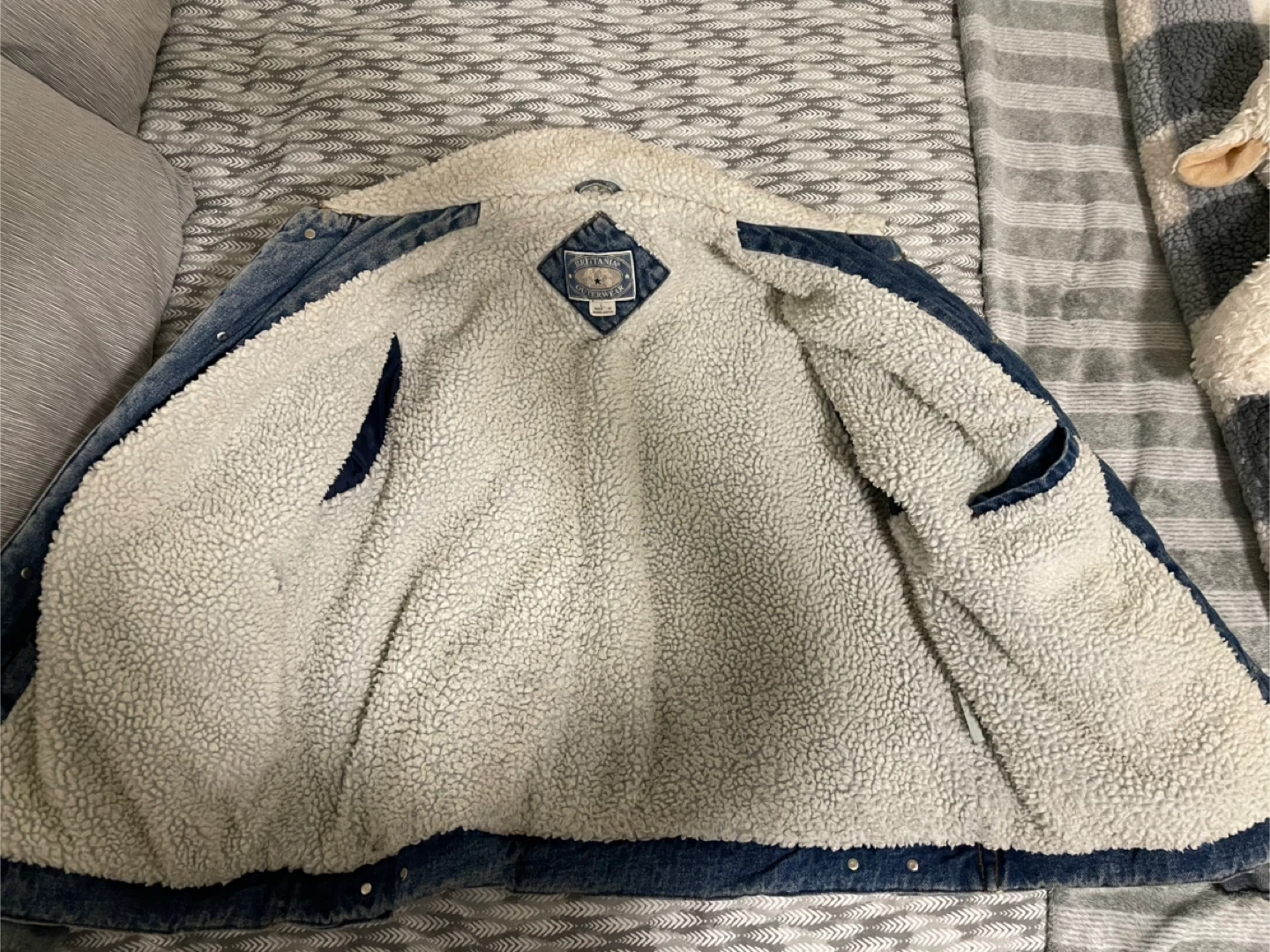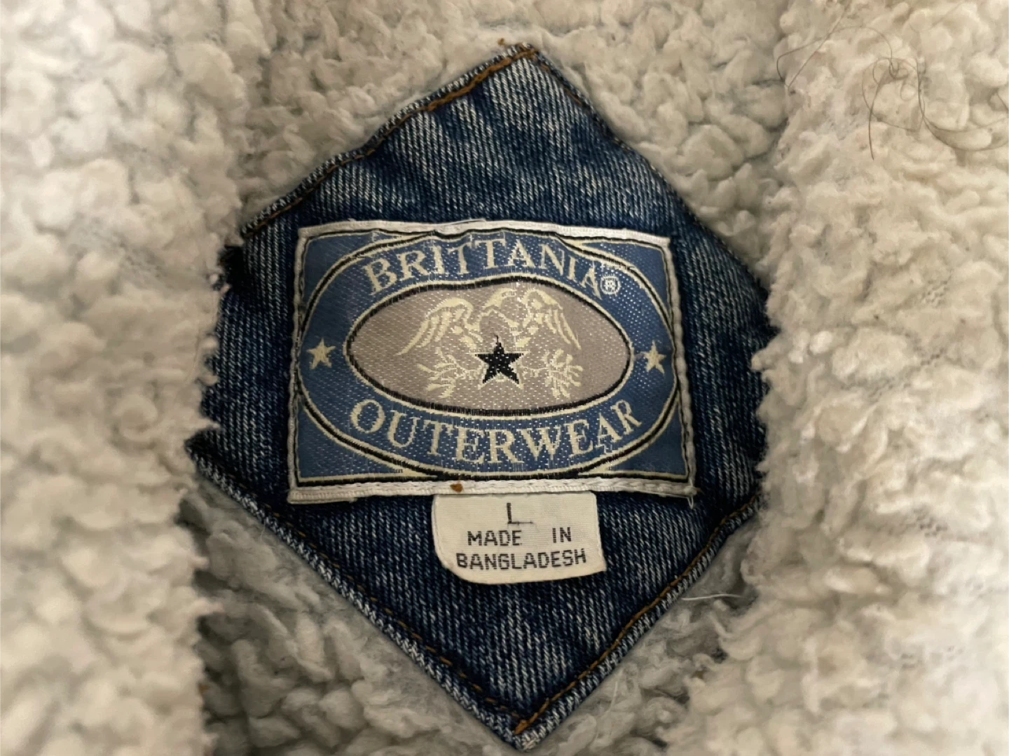 Classic Brittania denim jacket with a warm sherpa lining and collar. Features two chest pockets and two hand pockets. A great outerwear piece for cooler weather!