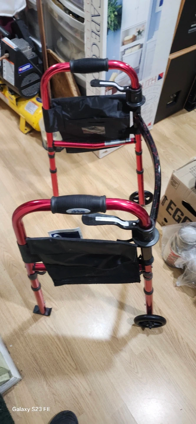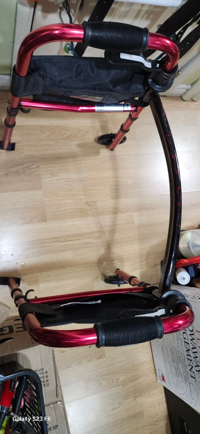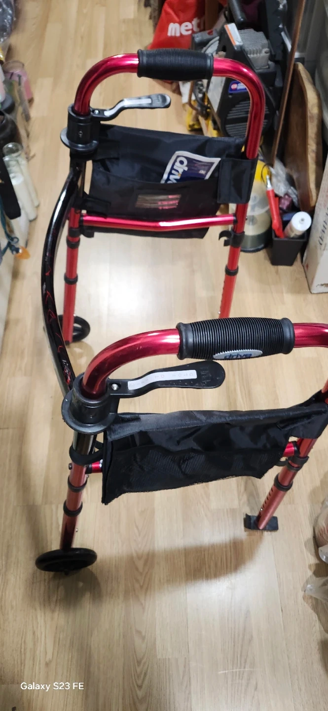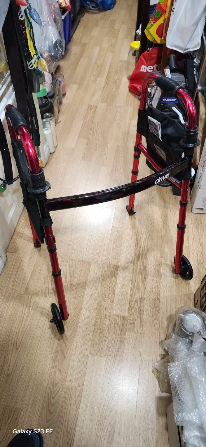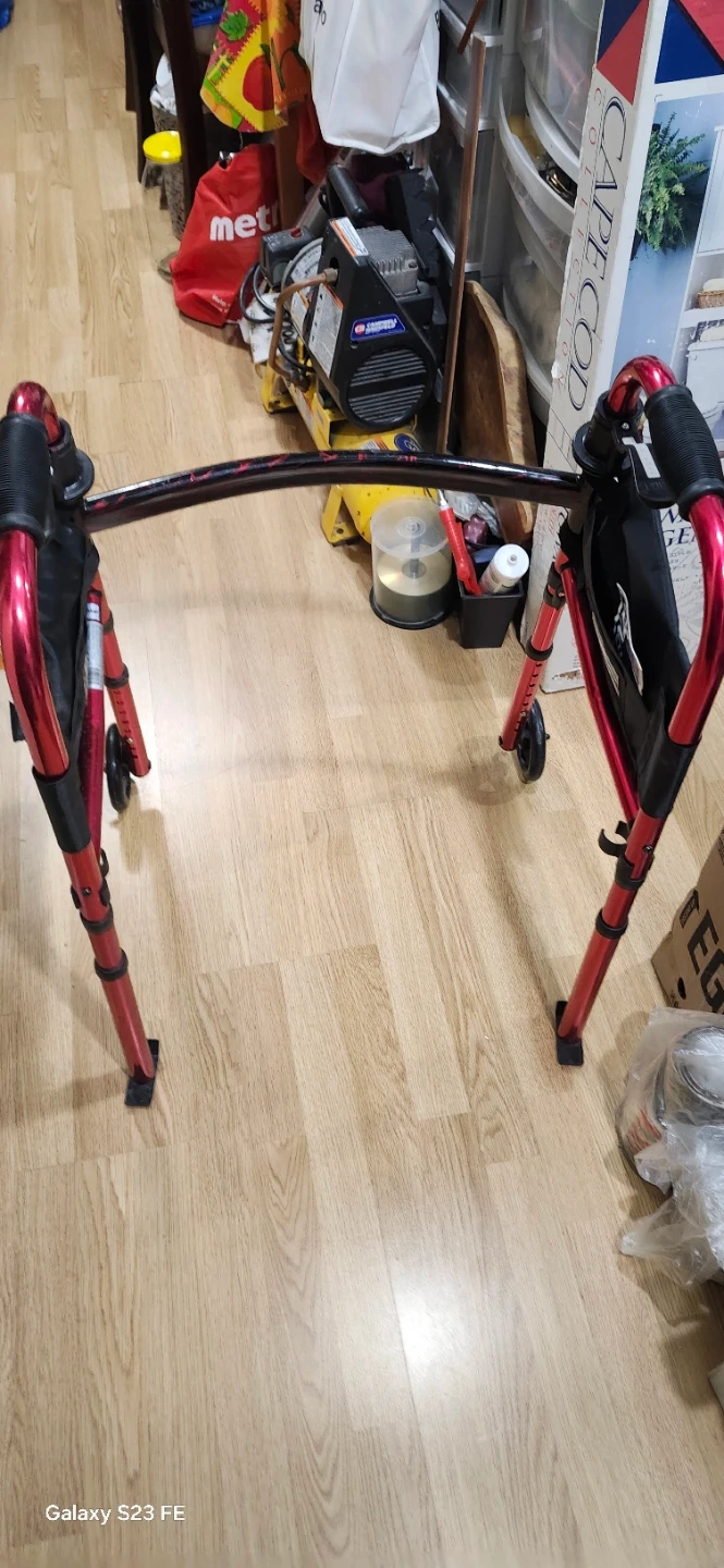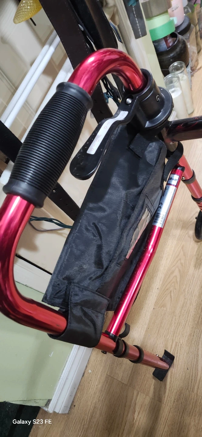 This red aluminum walker by Drive features comfortable grip handles and a convenient storage bag. It's designed for stability and ease of use. Some minor scuffs are visible on the frame. It offers support for individuals needing assistance with mobility. It's a lightweight option for everyday use. Price is firm only cash only pickup no delivery O'Connor drive outside TD Canada Trust bank door East York .
