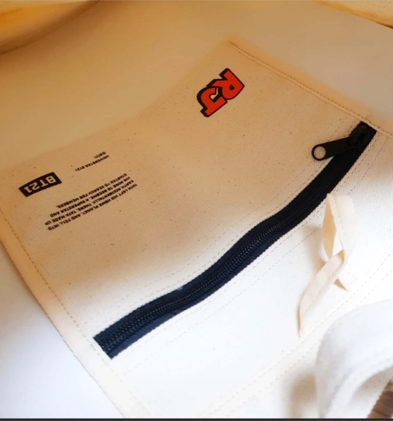 BT21 RJ canvas tote bag! It's in great condition. The bag features a cute RJ character design and a convenient zipper pocket inside.