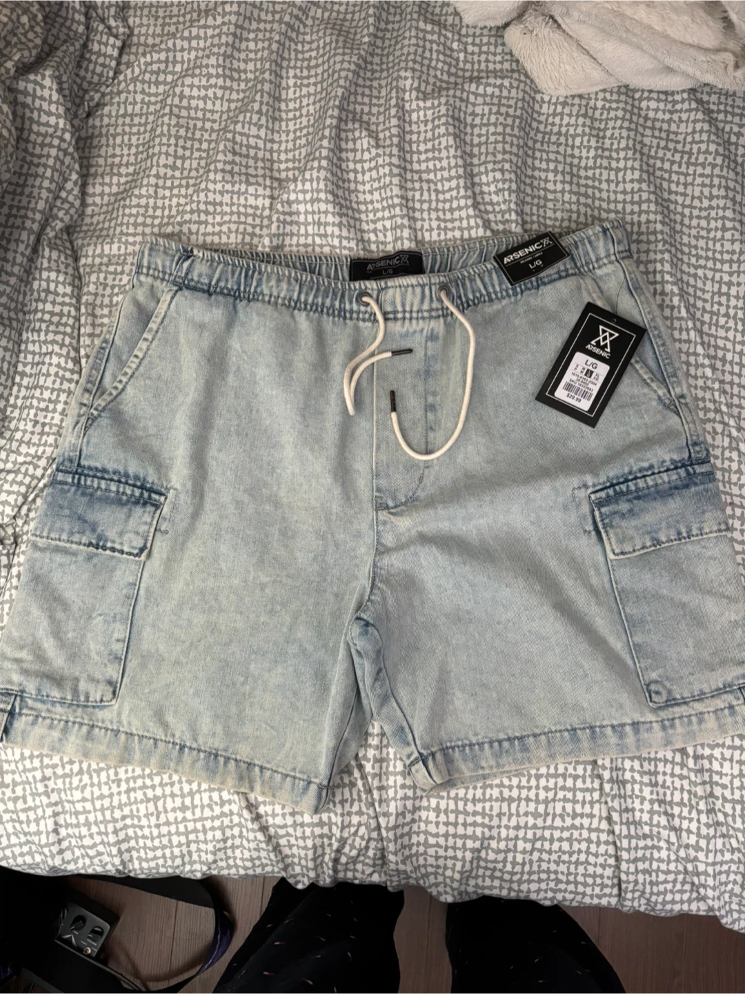 Selling a pair of Arsenic83 cargo shorts in size large! They're a light, faded denim colour and feature a comfortable elastic waistband with a drawstring. Perfect for casual wear or your next adventure!