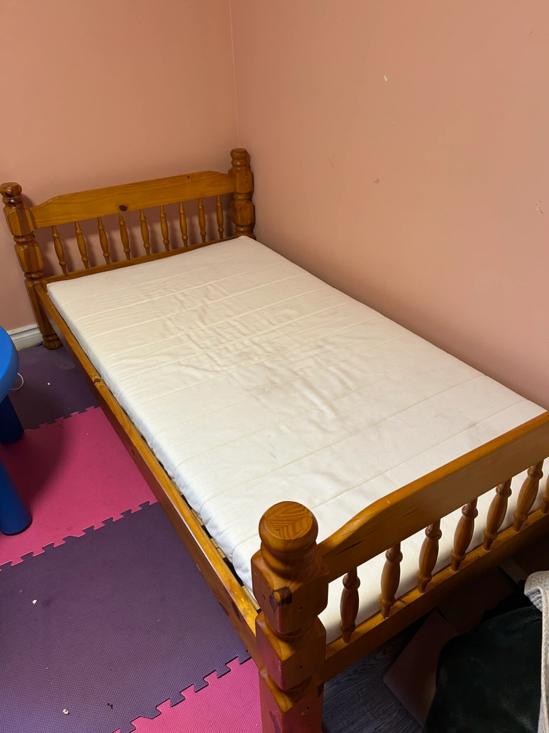 Selling a wooden twin bed frame. It's in good condition!Perfect for a kid's room or a guest room! $200/each, $350/two! IKEA Mattress free with the bed!