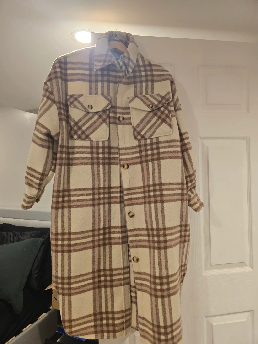 ONLY brand Cozy longline shacket in a classic plaid pattern. It's perfect for layering on cooler days. Features button-front closure and two chest pockets. Size XS Women's Shacket.