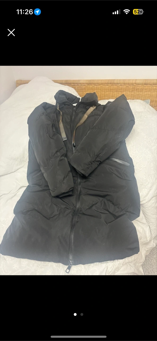 Black Prada puffer jacket with a full zip closure. It has a hood and two zippered pockets. Material is lightweight and suitable for cold weather. Size large