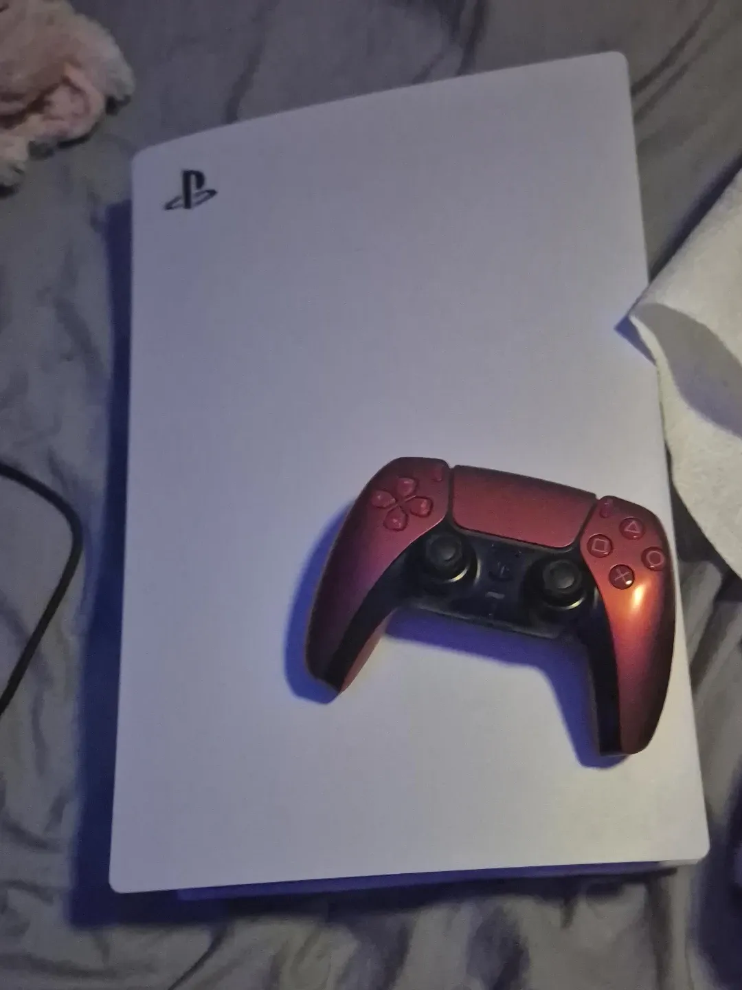 This is a PlayStation 5 console with a red DualSense controller. It's in good condition and ready for your next gaming adventure!