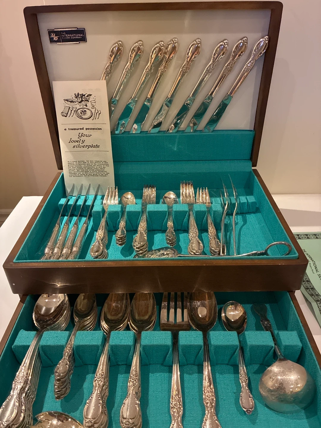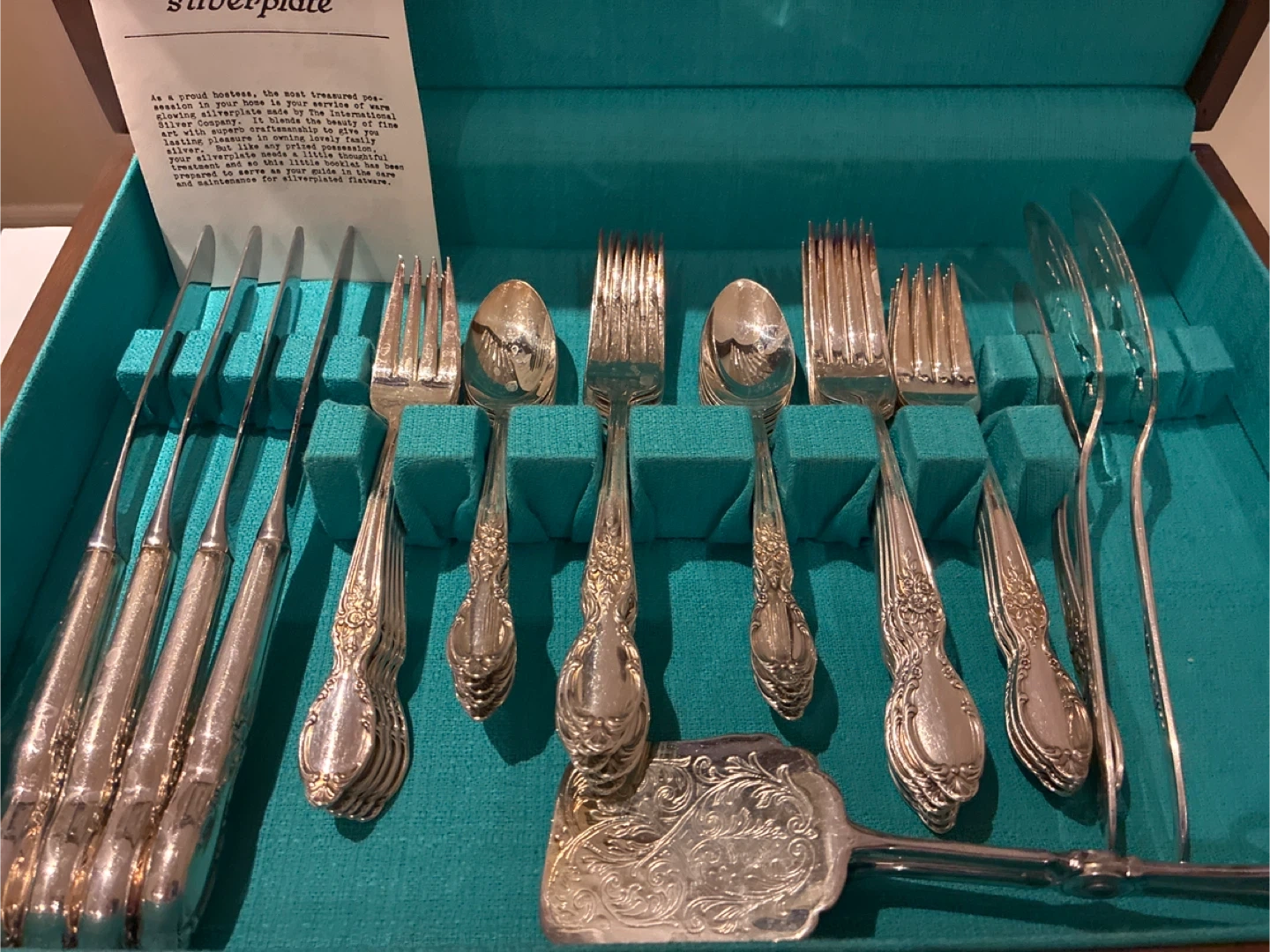 Selling a 95 pcs. Wm. Rogers & Son Original Rogers Silverplate flatware set. It's a complete set in a wooden case with a teal interior! The set features an extra deposit of silver at the point of greatest wear, ensuring durability and lasting shine. Knives have mirror stainless blades with silverplated handles.