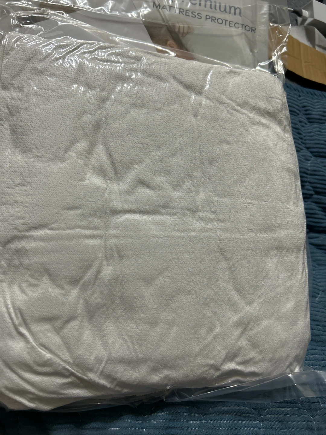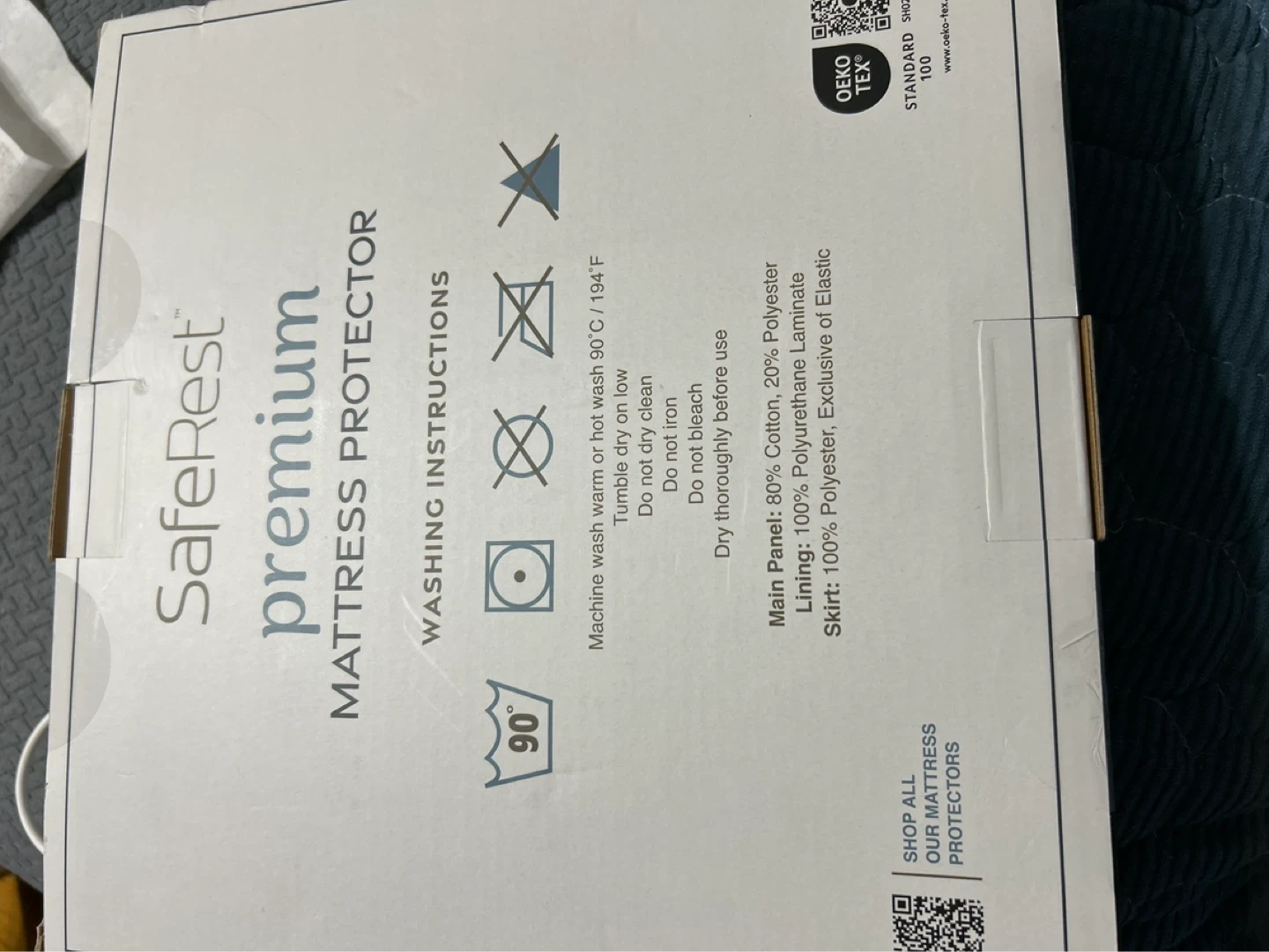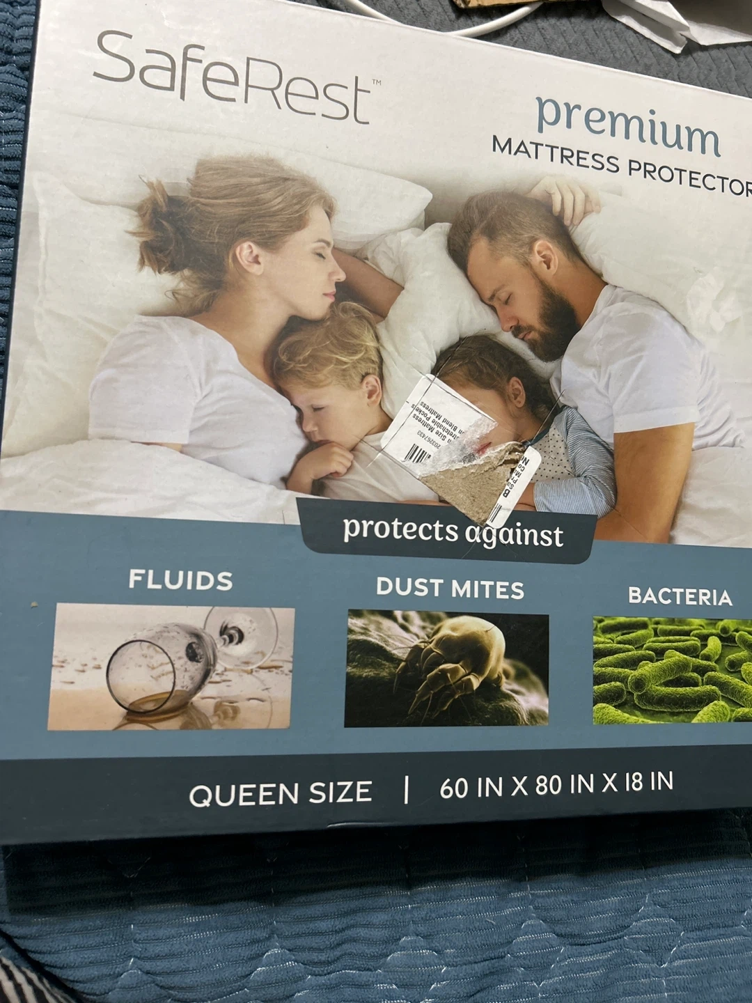 This is a Brand New-SafeRest premium mattress protector. It's designed for a queen-size bed. The protector measures 60 inches by 80 inches by 18 inches. It guards against fluids, dust mites, and bacteria.