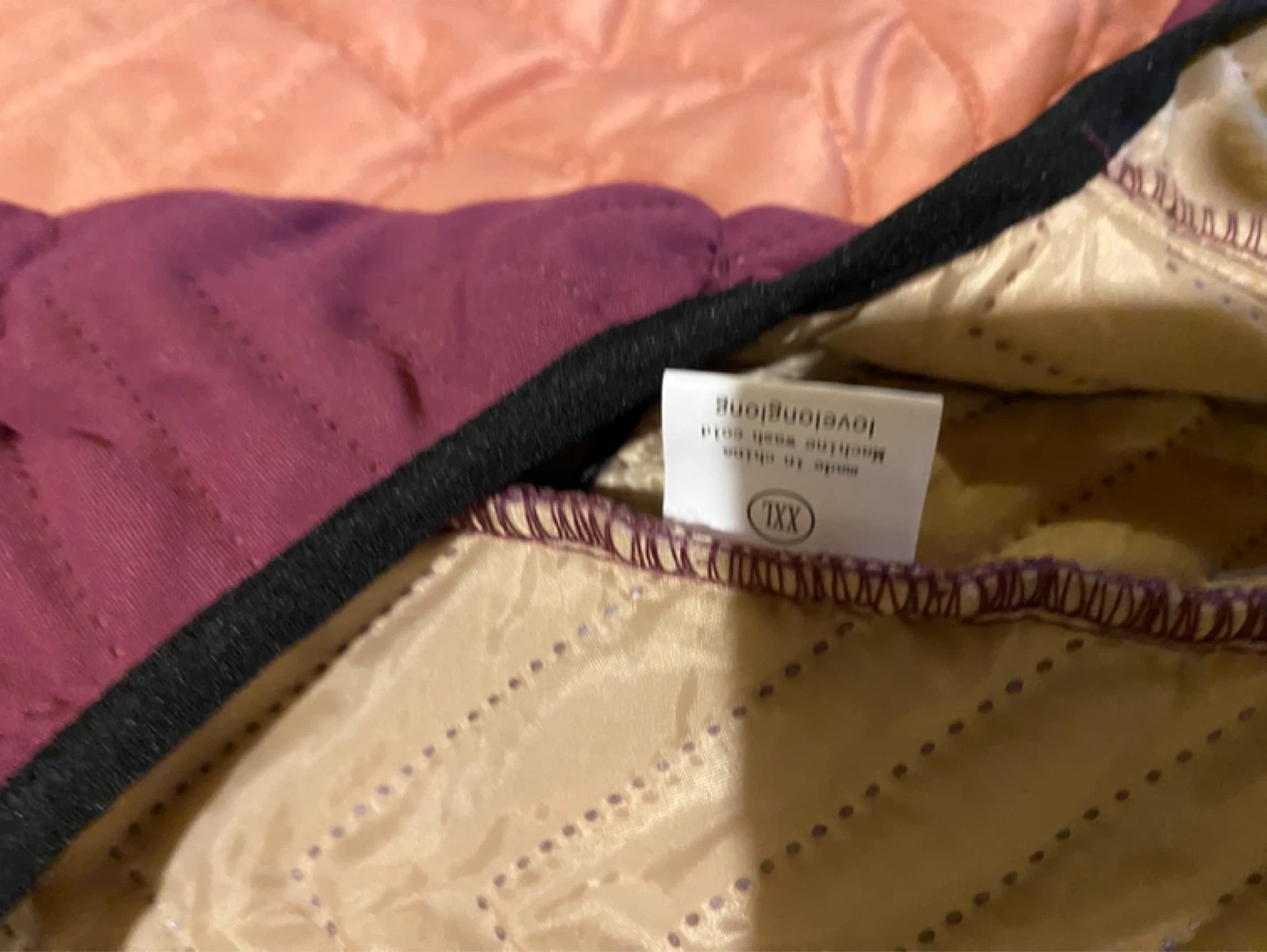 This quilted dog winter coat from LoveLongLong is designed for warmth. It features a burgundy exterior with a gold-toned quilted lining and adjustable buckle closures. The coat is size XXL and made for keeping your furry friend cozy in colder weather.