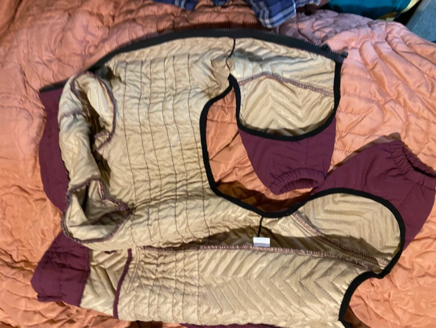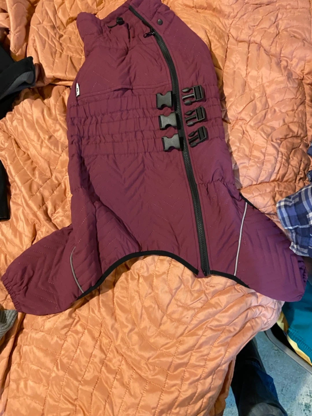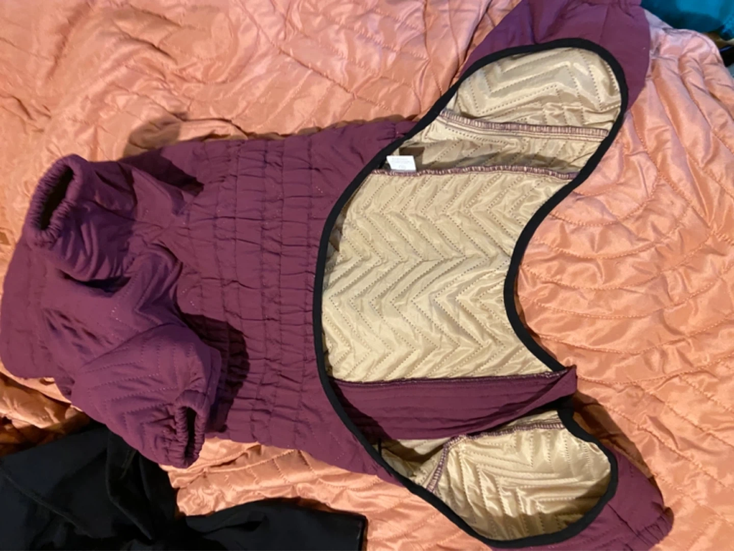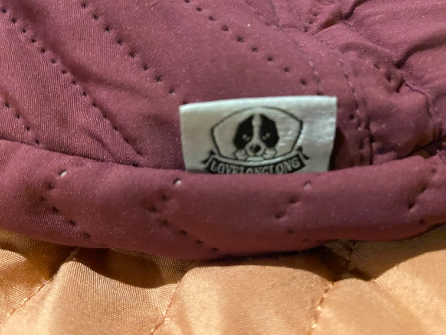 This quilted dog winter coat from LoveLongLong is designed for warmth. It features a burgundy exterior with a gold-toned quilted lining and adjustable buckle closures. The coat is size XXL and made for keeping your furry friend cozy in colder weather.