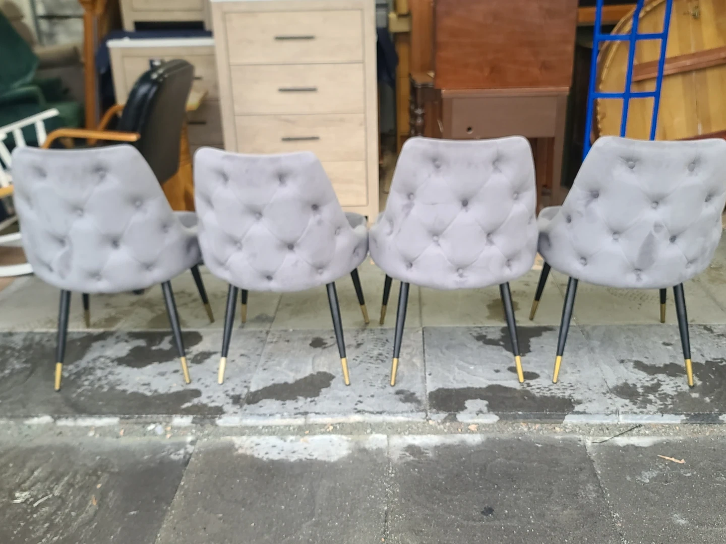 Set of 4 Grey Velvet Dining Chairs with Gold Accents